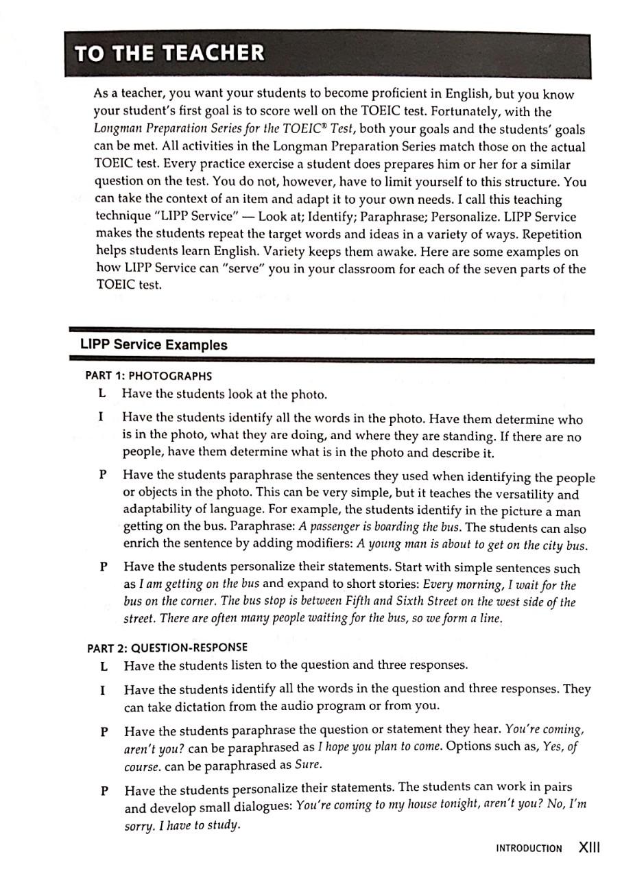 Longman Preparation Series for the TOEIC Test: Listening and Reading, Advanced Course, gives students the skills, strategies, practice, and confidence they need to increase their scores on the Listening and Reading, sections of TOEIC test. Ideal for a TOEIC test preparation course or for self-study, the Advanced Course is intended for student who achieve TOEIC test scores from 500 to 900. Features of New Edition - Three complete Pratice Tests include updated TOEIC test-style answer sheets for diagnosis and assessment. - 1000+ practice items reflect the actual format and content of the most recent TOEIC test. - Language Strategies and Test Strategies in each section help learners to focus on skills and set goals. - Highlighted Test Taking Tips provide grammatical explanations plus links to specific exercises for immediate help and reinforcement. - New Grammar Tips and Vocabulary Tips. - Complete Support containing answer key, complete MP3 files, and audiocripts helps students practice Listening Comprehension exercises and Listening Practice Test questions on their own .