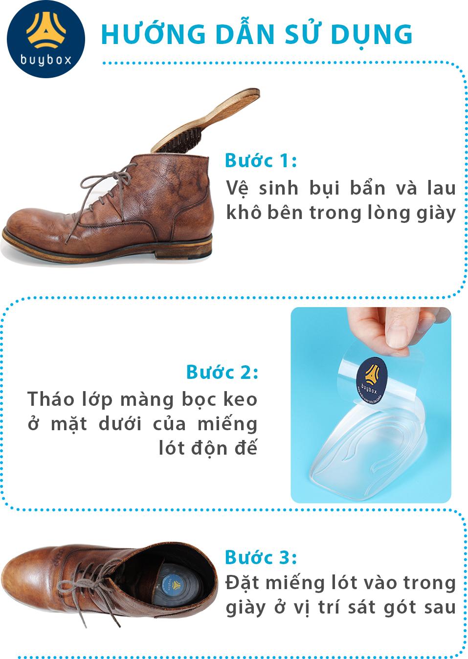 - Đặt lót giày tăng chiều cao vào giày ở vị trí sát gót, nhấn chặt xuống để keo dính cố định vào giày và sử dụng "buybox - NGƯỜI BẠN THÂN CỦA ĐÔI CHÂN"