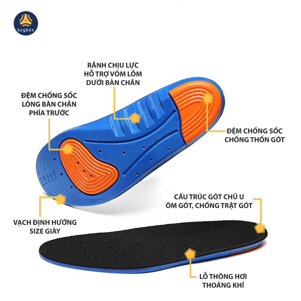 Lót giày thể thao EVA có 2 đệm chống sốc ở 2 vị trí quan trọng là gót và lòng bàn chân dưới các ngón, giảm áp lực lên các huyệt đạo, mô cơ.
