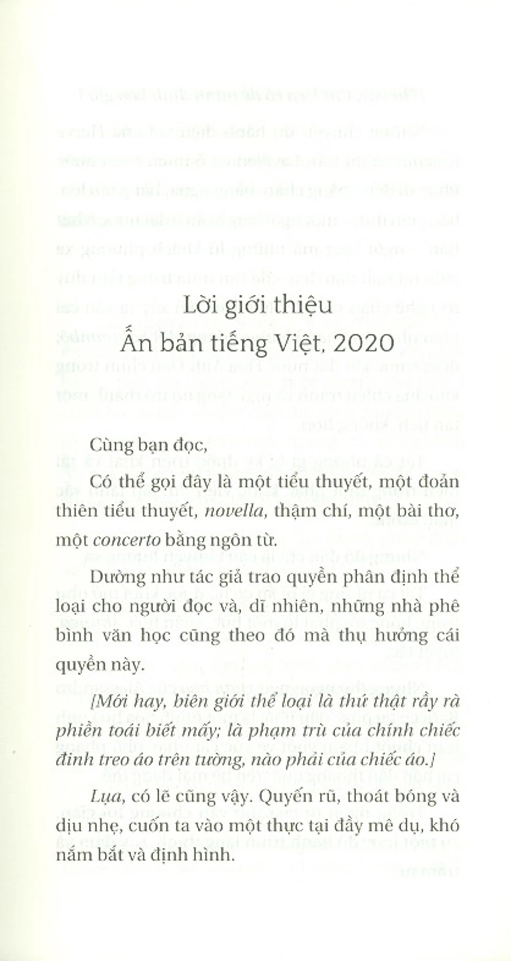 Tất cả mọi truyện đều có âm nhạc riêng. Truyện này có âm nhạc trắng. Nói lên điều này quan trọng lắm, vì âm nhạc trắng là một loại nhạc kỳ cục, đôi khi làm ta chưng hửng: nhạc diễn một cách dịu dàng, nhạc múa một cách chậm chạp. Khi nhạc được diễn hay, ta tưởng ta đang nghe niềm im lặng tấu lên, và những người múa nó thật tuyệt vời, ta nhìn họ và có cảm tưởng họ có múa đâu, họ bất động mà. Thật cực kỳ khó khăn, cái âm nhạc trắng này.