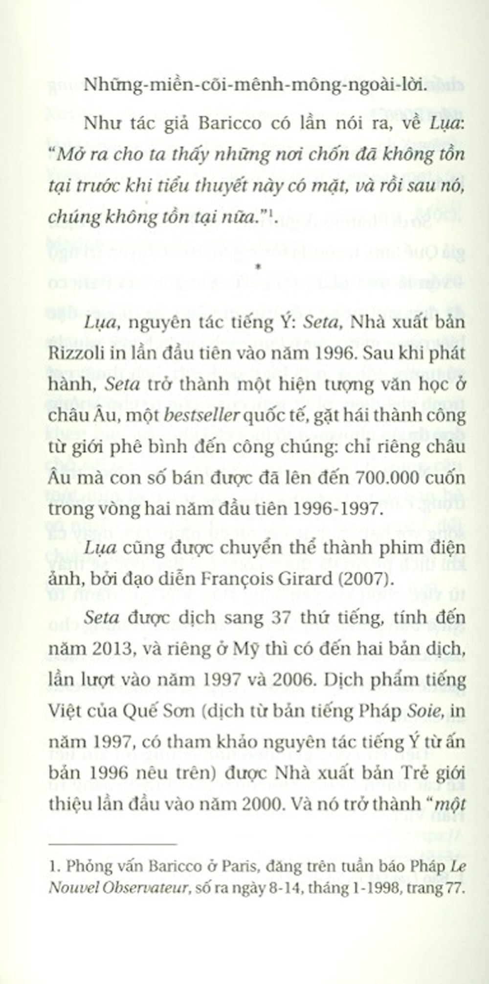 Đây không phải một cuốn tiểu thuyết. Cũng không phải một câu chuyện thuật lại. Đây là một truyện. Bắt đầu từ một người đàn ông từng đi xuyên thế giới rồi dừng chân lại bên hồ, một cái hồ nằm sẵn đó, như vậy đó, vào những ngày nhiều gió. Người đàn ông mang tên Hervé Joncour. Tên hồ, chẳng ai biết. Ta có thể nói đây là một truyện tình. Nhưng nếu chỉ có thế thôi thì có lẽ đáng gì đâu mà đem ra kể. Trong truyện này còn có những nỗi khát khao và những niềm đau khổ, những điều mà ai cũng biết rõ hoàn toàn nhưng tên gọi thật cho những điều đó chẳng ai tìm được bao giờ. Và dù sao đi nữa, đây không phải tình ái. (Cách làm này cũ quá rồi. Khi người ta không tìm ra tên gọi để nói lên những điều này nọ, người ta dùng truyện. Kiểu làm này được xài hoài. Từ nhiều thế kỷ nay.)