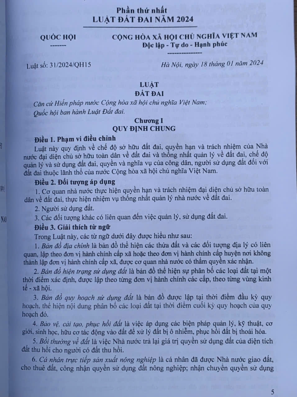 Luật Đất đai số 31/2024/QH15 được Quốc hội nước Cộng hòa xã hội chủ nghĩa Việt Nam khóa XV, kỳ họp bất thường lần thứ năm thông qua ngày 18 tháng 01 năm 2024,
