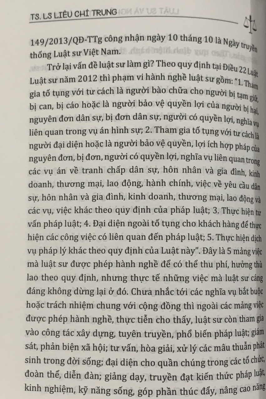 Là người tâm huyết với nghề, sau hàng chục năm làm báo và hành nghề luật sư, lần này Luật sư Liêu Chí Trung cho ra mắt cuốn sách “Luật sư và nghề luật sư ở Việt Nam”. Sách dày hơn 400 trang do Nhà xuất bản Lao động xuất bản, được tập hợp từ những bài viết của tác giả, trong đó hầu hết đã đăng trên Tạp chí Luật sư Việt Nam và hoạt động liên quan đến các nhân vật, sự kiện cụ thể. Bên cạnh đó, do tác giả có thời gian dài gắn bó với công tác truyền thông của Liên đoàn Luật sư Việt Nam và với tình cảm, trách nhiệm nghề nghiệp, cuốn sách còn cung cấp đến bạn đọc nhiều thông tin, tư liệu, hình ảnh quý về quá trình phát triển của nghề luật sư và hoạt động của Liên đoàn Luật sư Việt Nam.