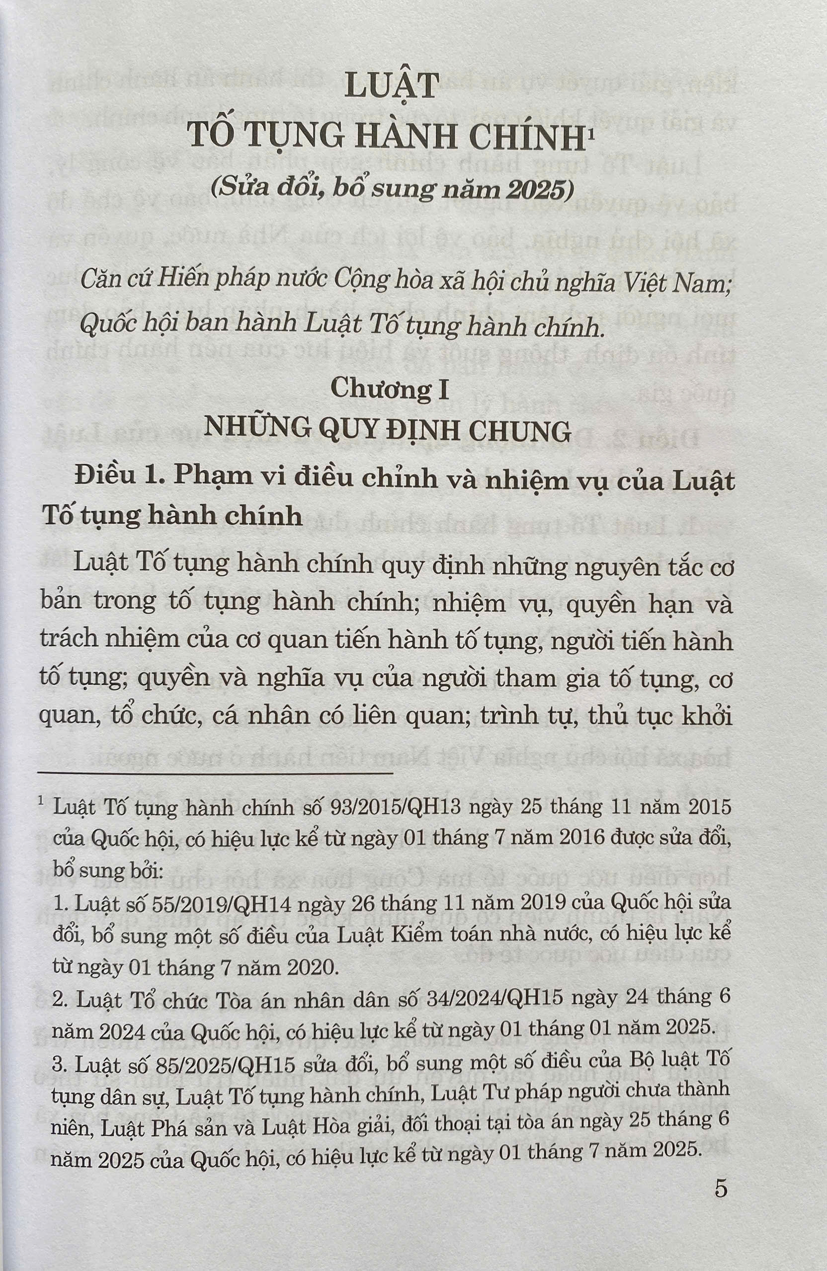 Luật Tố tụng hành chính số 93/2015/QH13 được Quốc hội khóa XIII thông qua ngày ngày 25-11-2015, được sửa đổi, bổ sung theo Luật Kiểm toán nhà nước số 55/2019/2014 ngày 20-11-2019, Luật Tố chức Tòa án nhân dân số 34/2024/QH15 ngày 24-06-2024, gần đây nhất Quốc hội khóa XV cũng đã ban hành Luật số 85/2025/QH15 ngày 25-06-2025 Sửa đổi, bổ sung một số Điều của Bộ luật Tố tụng dân sự, Luật Tố tụng hành chính, Luật tư pháp người chưa thành niên, Luật Phá sản và Luật Hòa giải, đối thoại tại Tòa án, có hiệu lực thi hành từ ngày 01-07-2025. Việc ban hành Luật Tố tụng Hành chính sửa đổi là một quá trình quan trọng nhằm tạo cơ sở pháp lý đầy đủ và toàn diện hơn để Tòa án nhân dân giải quyết các khiếu kiện hành chính có hiệu quả, góp phần bảo vệ tốt hơn các quyền, lợi ích hợp pháp của cá nhân, cơ quan, tổ chức; bảo vệ lợi ích của Nhà nước; tăng cường pháp chế xã hội chủ nghĩa và phù hợp với những cam kết quốc tế của Việt Nam.