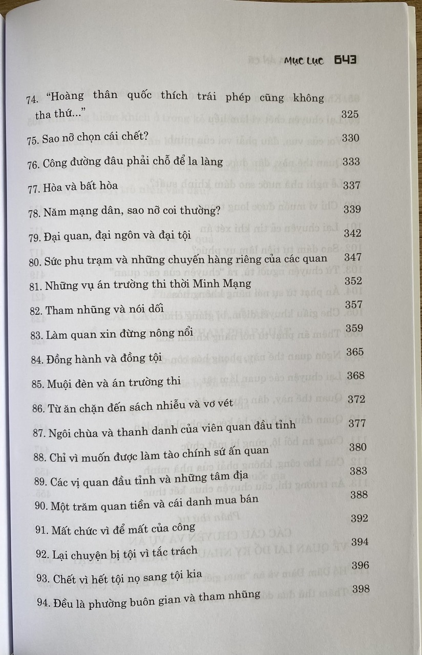 Mua tại TiktokTrong cuốn sách, tác giả đã công phu tập hợp 136 câu chuyện pháp luật thời phong kiến, được ghi lại trong các bộ chính sử của nước nhà; phân tích kỹ các tình tiết của các câu chuyện pháp luật, trong đó nhiều câu chuyện là những vụ án nổi tiếng trong lịch sử phong kiến Việt Nam, với sự có mặt của đủ các giai tầng xã hội từ vua chúa, đội ngũ quan lại các cấp, đến những người dân bình thường; liên quan tới rất nhiều mặt của đời sống xã hội.