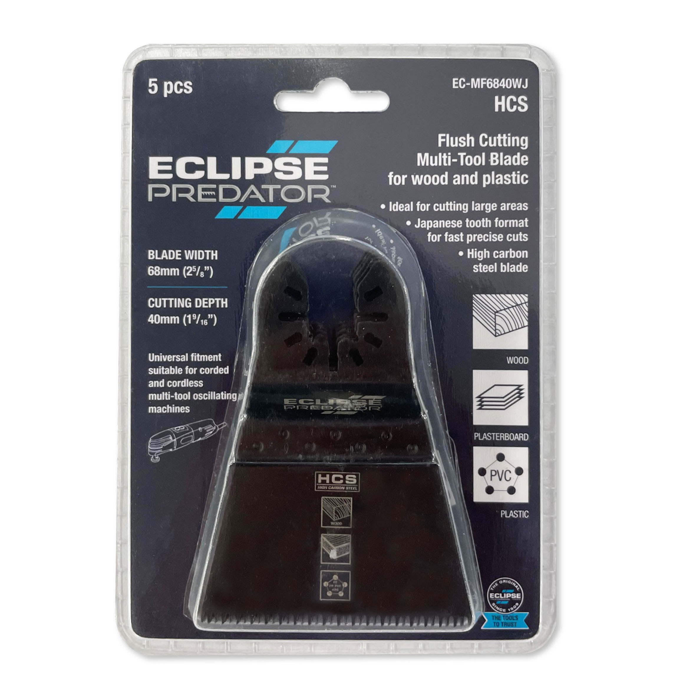 Lưỡi cắt rung răng kiểu Nhật bản 68mm Eclipse EC-MF6840WJLưỡi cắt rung cắt phẳng bằng thép cacbon cao (HCS) cho gỗ và nhựaThiết kế răng Nhật Bản để cắt gỗ, lớp phủ gỗ, sàn, nhựa, tấm thạch cao và vá...