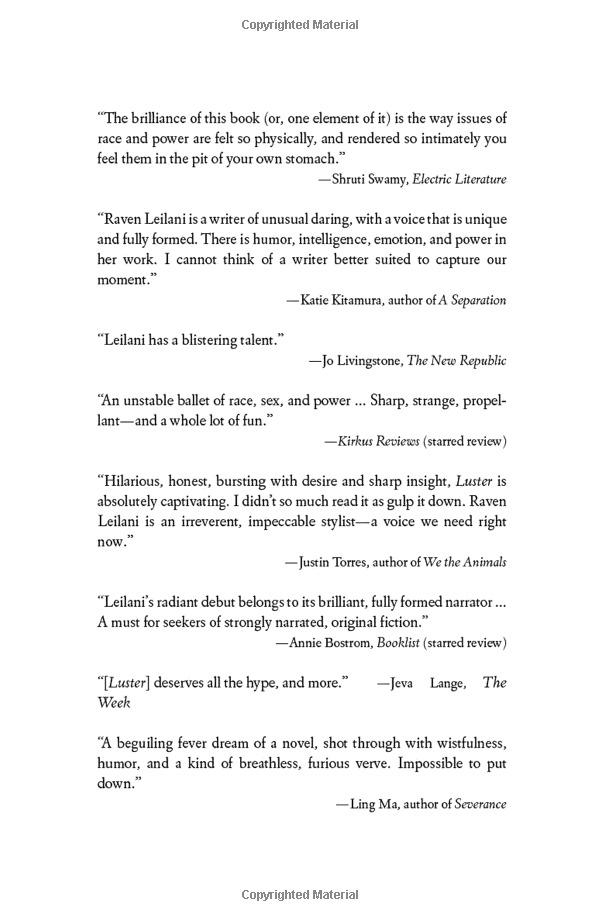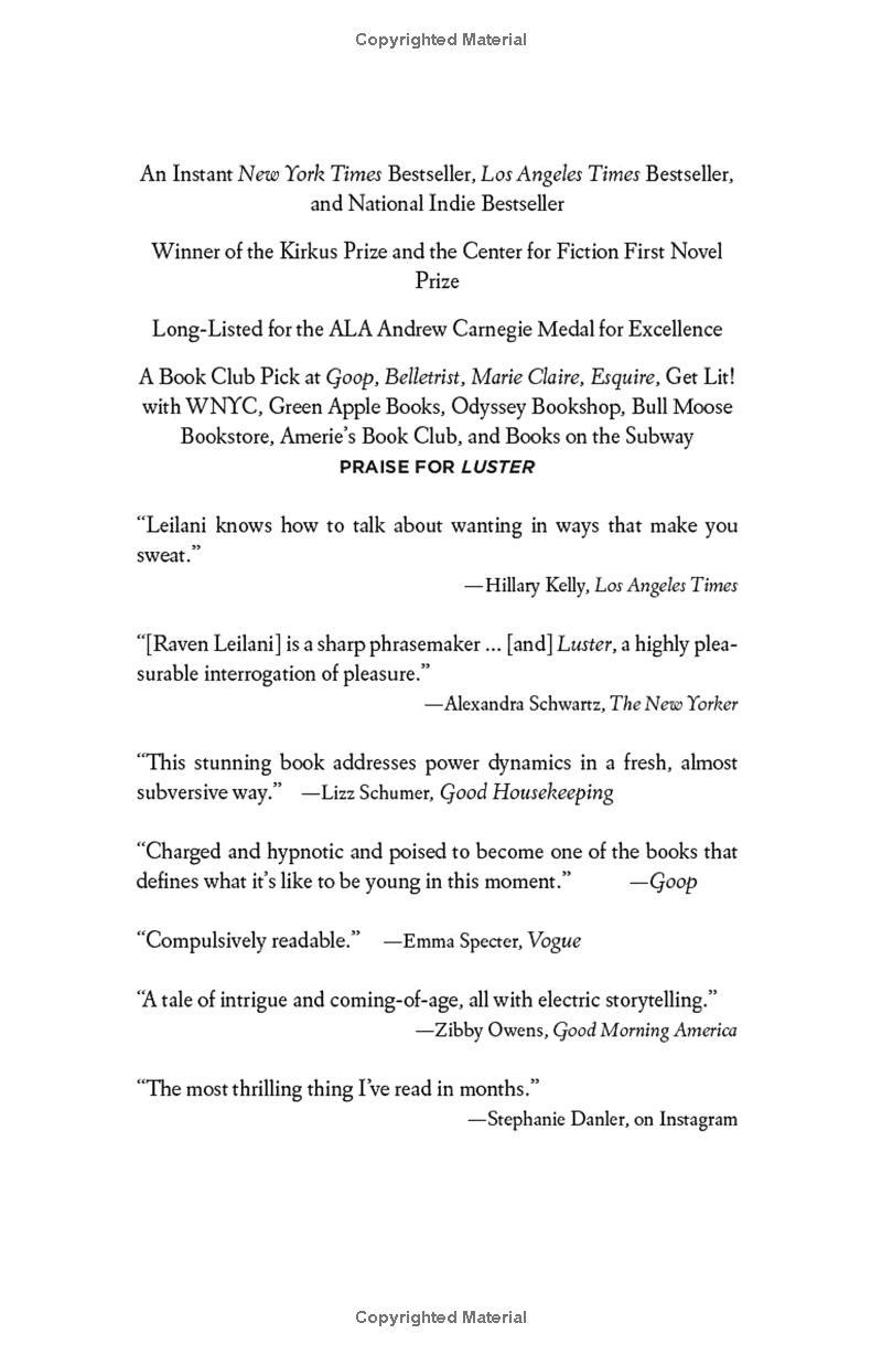 Irresistibly unruly and strikingly beautiful, razor-sharp and slyly comic, sexually charged and utterly absorbing, Raven Leilani’s Luster is a portrait of a young woman trying to make sense of her life―her hunger, her anger―in a tumultuous era. It is also a haunting, aching description of how hard it is to believe in your own talent, and the unexpected influences that bring us into ourselves along the way.