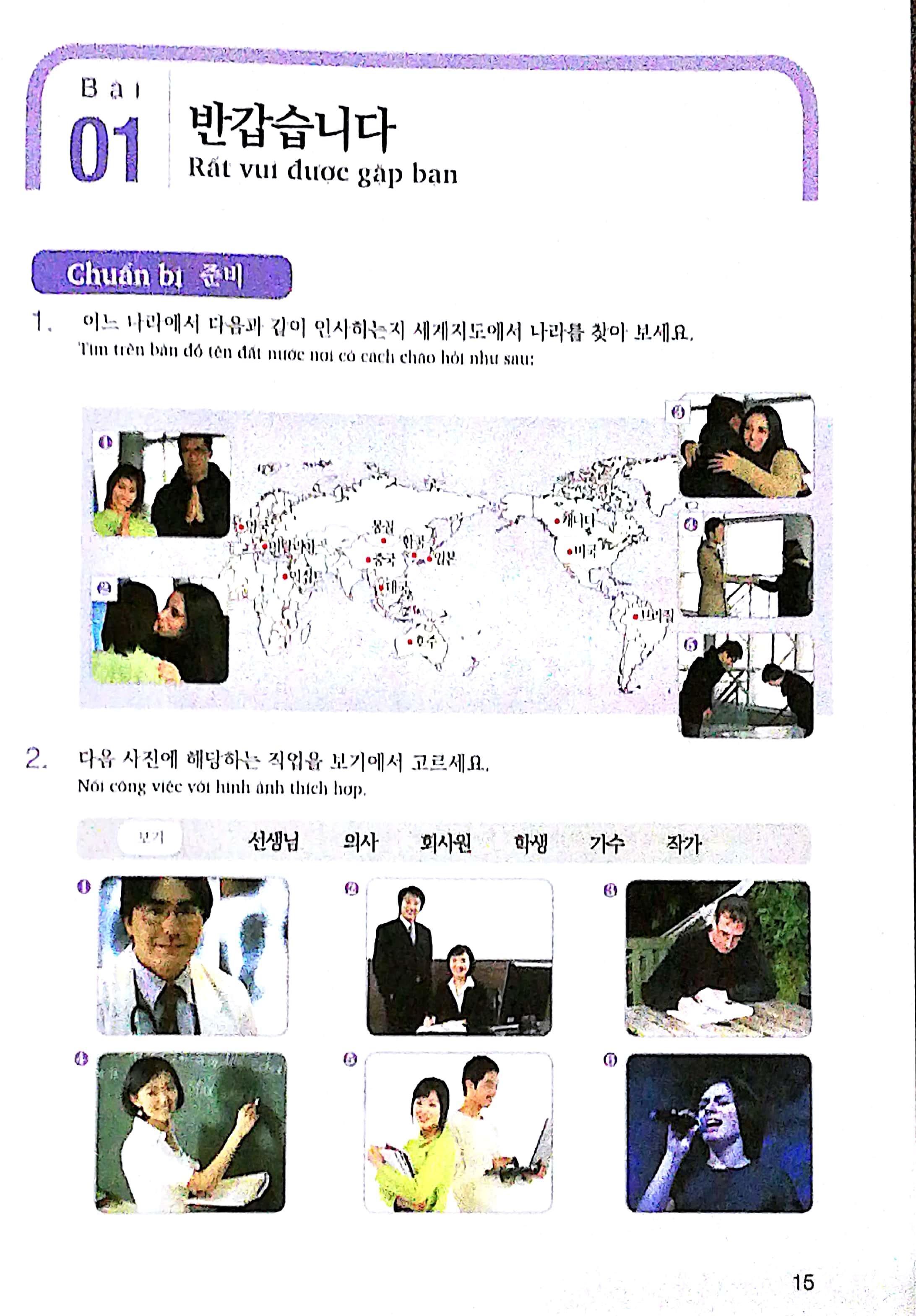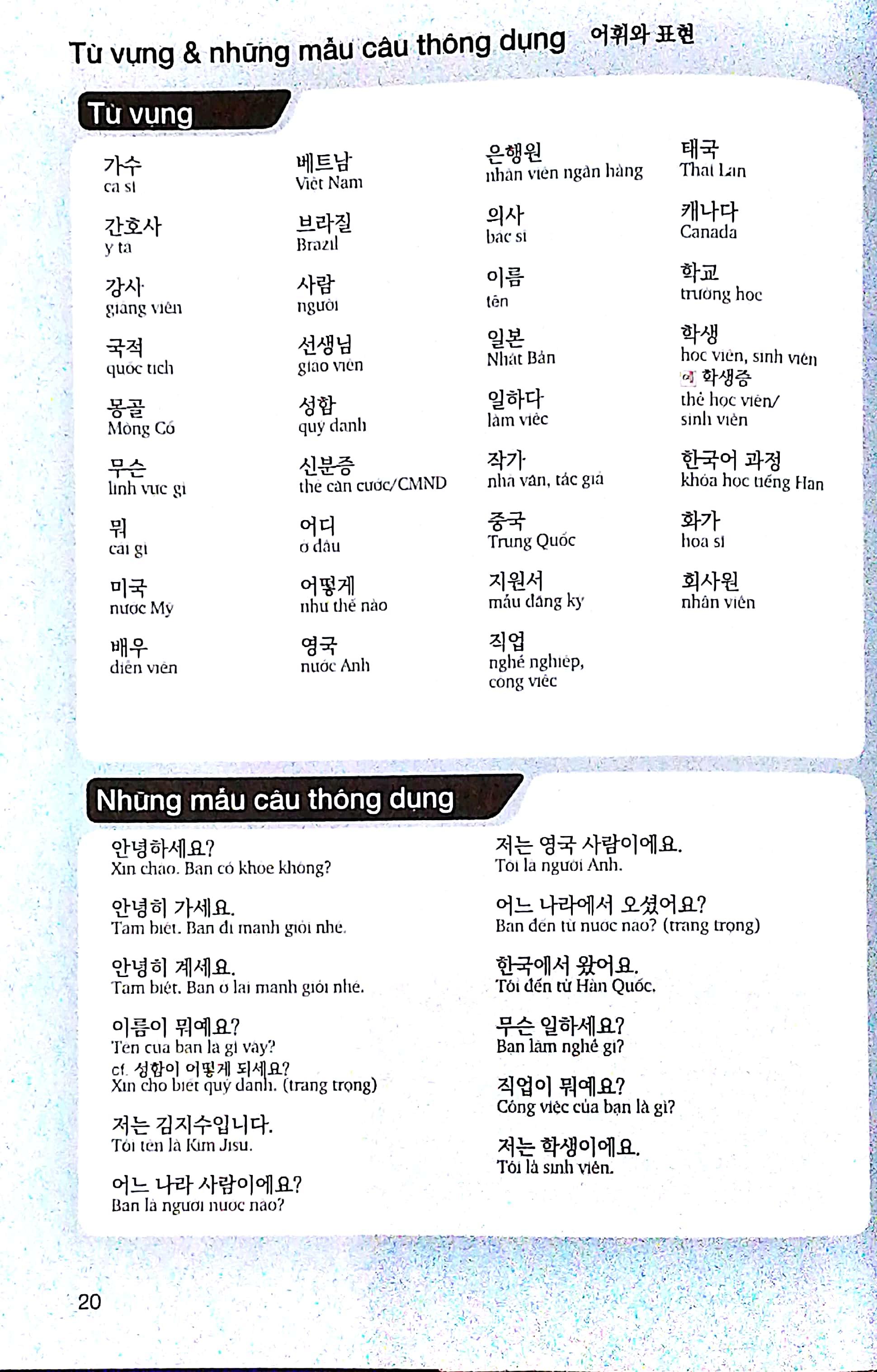 Tiếng Hàn Tổng Hợp Dành Cho Người Việt Nam - Sơ Cấp 1 Trong những năm gần đây, nhu cầu học tiếng Hàn và tìm hiểu về văn hóa Hàn Quốc đang có xu hướng tăng lên. Người học tiếng Hàn rất mong muốn có được một bộ giáo trình chuẩn, được biên soạn một cách tỉ mỉ và hữu ích nhất. Giáo trình tiếng Hàn tổng hợp lần đầu tiên được trao bản quyền chính thức tại Việt Nam Hiểu được điều đó, ngày 4-7, Đại diện chính phủ Hàn Quốc, ngài Woo Hyeong Min – Trưởng đại diện Văn phòng Quỹ giao lưu Quốc tế HQ tại Việt Nam cùng GS.TS.NGƯT Mai Ngọc Chừ – Chủ tịch Hội Nghiên cứu khoa học về Hàn Quốc của Việt Nam (KRAV) đã trao quyết định cho phép Công ty Cổ phần sách MCBooks của Việt Nam được xuất bản cuốn sách này tại thị trường Việt Nam. Và đây chính là bộ giáo trình tiếng Hàn tổng hợp đầu tiên có bản quyền chính thức có mặt tại Việt Nam. Cũng theo ông Woo Hyeong Min, Thực tế đây là bộ giáo trình chính thống mà tất cả người học tiếng Hàn tại Việt Nam cần sử dụng. Tuy nhiên nhiều năm qua bộ sách đến tay người dùng đều là sách lậu nên chưa đạt được kết quả mà chính phủ Hàn muốn mang tới Việt Nam. Do đó Chính phủ Hàn Quốc đã quyết định tìm 1 đơn vị xuất bản uy tín của Việt Nam để giúp họ mang đến cho người học những cuốn sách tiếng Hàn chất lượng tốt với giá cả hợp lý. Bộ giáo trình được Hội nghiên cứu khoa học Hàn Quốc của Việt Nam biên soạn và hiệu đính. Bộ giáo trình sẽ giúp nâng cao hiệu quả trong việc sử dụng ngôn ngữ Hàn sau tiếng mẹ đẻ và tiếng Anh, là nền tảng giúp người lao động Việt Nam nhận được những vị trí làm việc cao trong doanh nghiệp Hàn Quốc. Đây cũng là cách để thúc đẩy quan hệ hợp tác về văn hoá và giáo dục giữa hai nước trong thời gian tới. Giới thiệu cuốn Giáo trình tiếng Hàn tổng hợp dành cho người Việt Nam – Sơ cấp 1 Giáo trình tiếng Hàn tổng hợp dành cho người Việt Nam – Sơ cấp 1 được biên soạn dành cho người Việt Nam muốn học tiếng Hàn ở trình độ sơ cấp. Sách được biên soạn nhằm hướng tới việc sử dụng được trong các tiết học tiếng Hàn tại giảng đường đại học nên mỗi bài học được chia thành nhiều phần như: Lý thuyết cơ bản gồm từ vựng và cấu trúc ngữ pháp; phần luyện tập theo 4 kỹ năng giao tiếp như: Nghe – Nói – Đọc – Viết, phần luyện phát âm, phần tìm hiểu văn hóa… Các chủ đề trong sách được sắp xếp một cách có hệ thống và liên quan chặt chẽ với nhau. Giáo trình tiếng Hàn tổng hợp được biên soạn kèm theo một cuốn sách bài tập hỗ trợ giúp người học ôn tập kỹ hơn và có thể luyện tập nâng cao trong những trường hợp cần thiết. Nội dung trong Giáo trình tiếng Hàn tổng hợp – Sơ cấp 1 2 cuốn sách trong bộ Sơ cấp được xây dựng với 30 bài khóa và bảng chữ cái. Trong đó quyển 1 gồm phần bảng chữ cái và 15 bài đầu. Học hết quyển 1, bạn sẽ học đến quyển sơ cấp 2 với 15 bài còn lại. Cấu trúc tổng thể của giáo trình được xây dựng theo các chủ đề; mỗi chủ đề được liên kết thống nhất với một hệ thống các từ vựng và cấu trúc ngữ pháp cơ bản, bài tập ứng dụng, kỹ năng và tìm hiểu văn hóa. Trong mỗi bài học, nội dung học được chia thành các phần như: luyện từ vựng, luyện ngữ pháp cơ bản, luyện tập kỹ năng nghe – nói – đọc – viết, luyện phát âm, tìm hiểu văn hóa của đất nước Hàn Quốc xinh đẹp. Và kết thúc mỗi bài đều có thêm bảng từ mới xuất hiện trong bài học. Phần cuối của sách, các tác giả đưa ra hệ thống từ mới được sắp xếp theo thứ tự của bảng chữ cái. Đây là những từ không xuất hiện trong phần ngữ pháp, từ vựng cơ bản; nhưng lại xuất hiện nhiều ở phần luyện tập của từng bài.