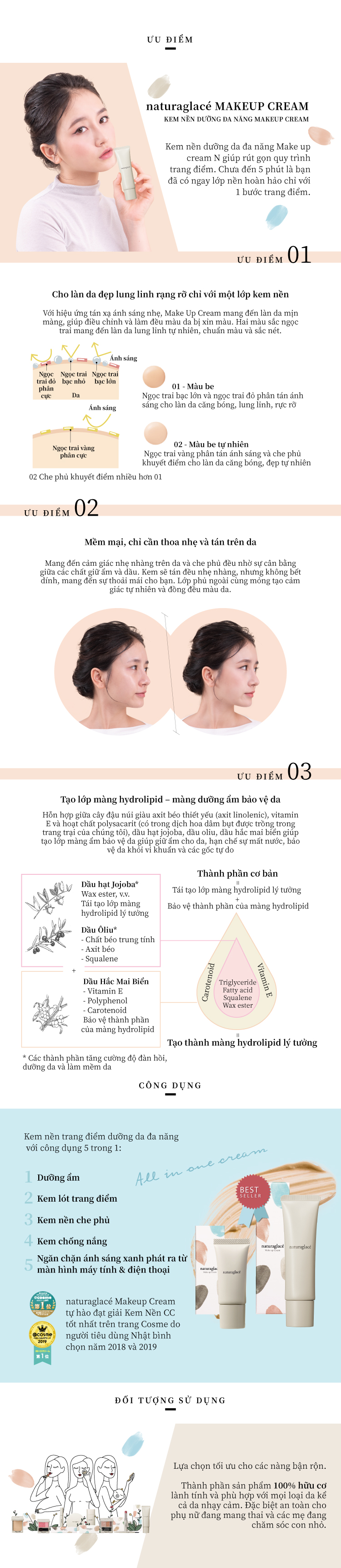 Công dụng: Đây là sản phẩm vượt trội với ba công dụng: ngăn ngừa nắng, trang điểm vàdưỡng da trắng sáng. Có tác dụng tạo lớp nền che phủ tự nhiên mỏng mịn, tăng độ