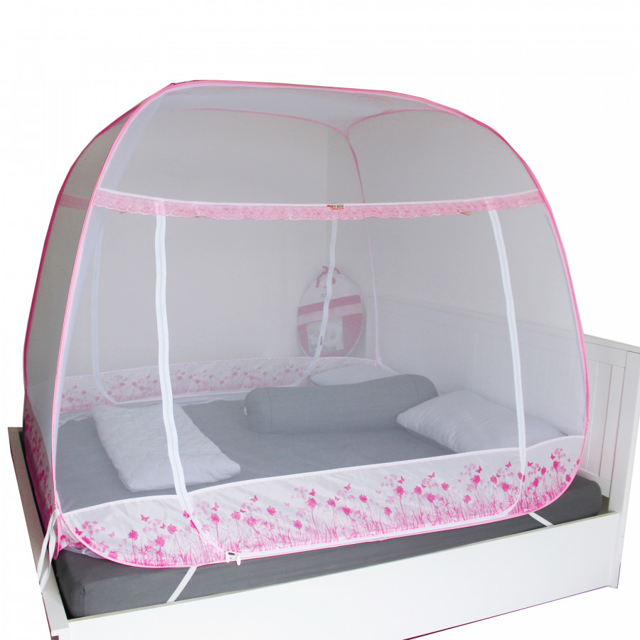 MÀN CHỤP , MÙNG CHỤP CAO CẤP MỘC MIÊN ĐỈNH RỘNG : Màn chụp tự bung cao cấp Mộc Miên đỉnh rộng trắng viền hồng loại 1,6m x2m - 3 cửa :  Xuất xứ :