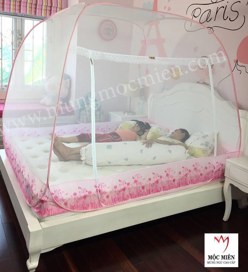 Màn chụp tự bung cao cấp Mộc Miên đỉnh rộng trắng viền hồng loại 1,6m x2m - 3 cửa :