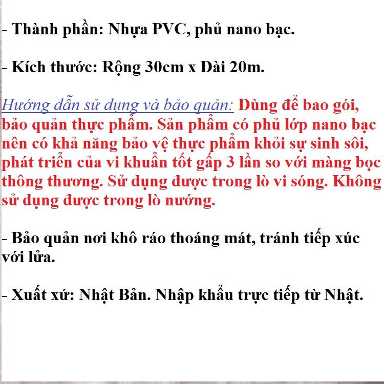 Màng bọc thực phẩm kháng khuẩn Hitachi 30cm x 20m - Thành phần: Nhựa PVC, phủ nano bạc. - Kích thước: Rộng 30cm x Dài 20m. - Hướng dẫn sử dụng và bảo quản: Dùng