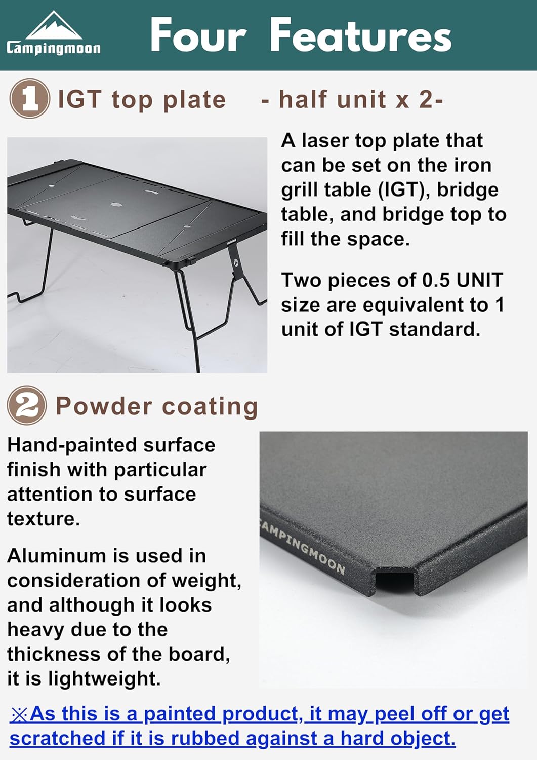 Mặt bàn nhôm một phần hai Campingmoon IGT CK-12BK-2P được khắc bằng laser có thể sử dụng trên bàn nướng, kệ CK-2, khung bàn IGT Campingmoon CK-3650-T38. Hai tấm nhôm này tương đương với một đơn vị tiêu chuẩn IGT nên cũng có thể được sử dụng để lấp đầy khoảng trống của các sản phẩm kệ sắt (IGT) khác.