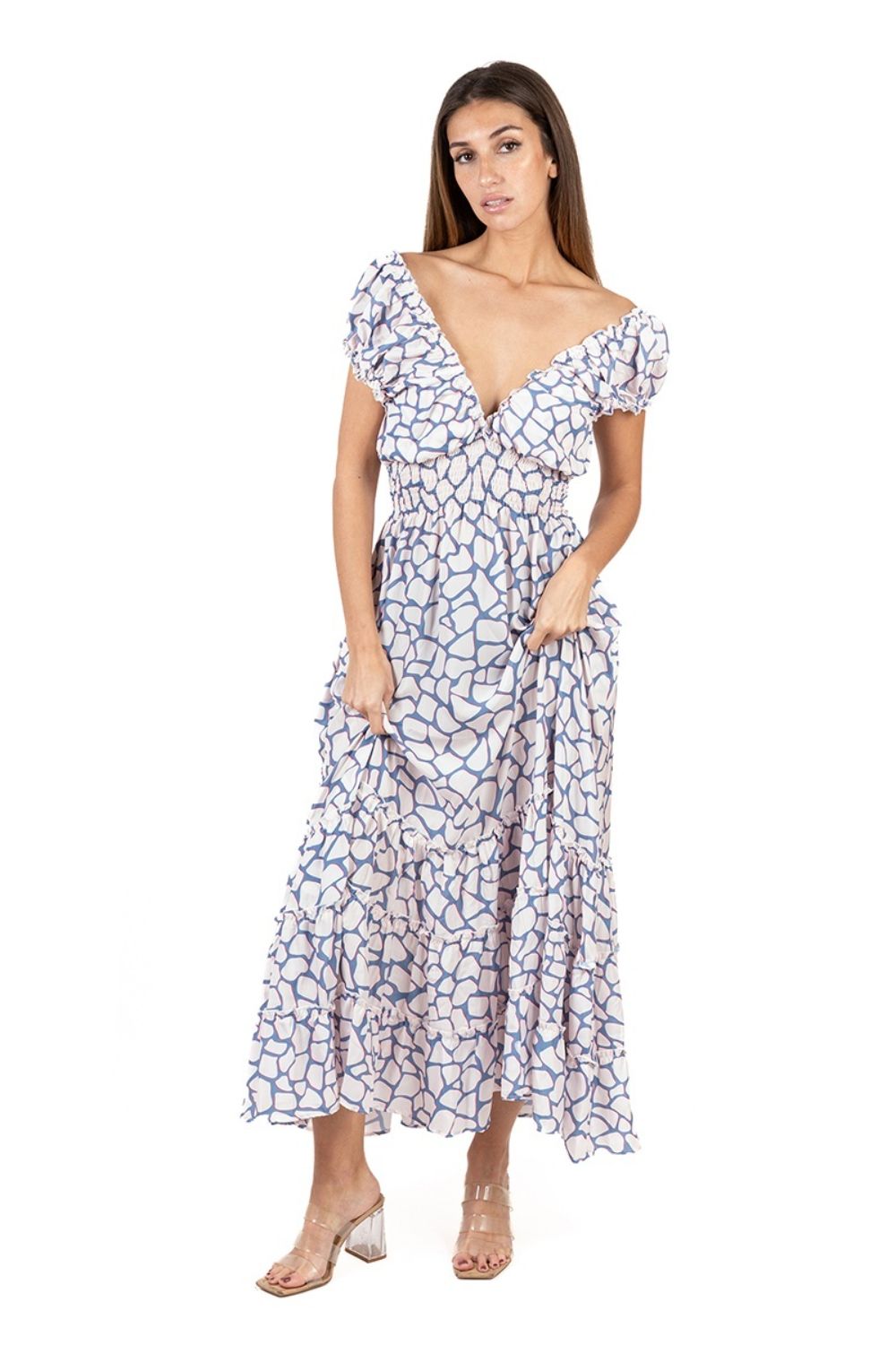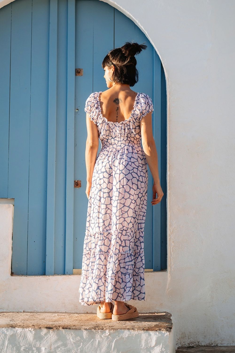 Maxi Cổ V Cotton Isla Bonita, chất liệu lụa mềm mại, cao cấp, nền vải trắng trang nhã họa tiết xanh tinh tế. Có thể mặc cổ V hoặc kéo thành trễ vai. Eo thun