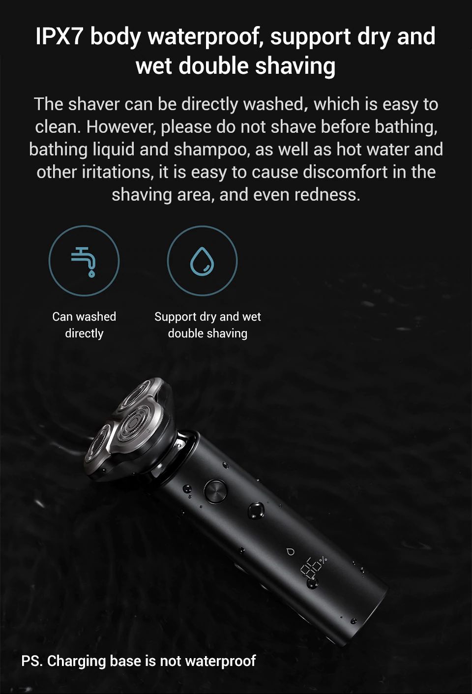 - Màu sắc: đen Máy cạo râu Mijia S500 là một thiết bị không thể thiếu cho các quý ông lịch lãm. Máy không những giúp bạn luôn giữ phong thái “mày râu nhẵn nhụi”, mà còn giúp tiết kiệm thời gian, công sức cho công việc chăm sóc vẻ ngoài của mình. Máy cạo râu Electric Shaver Mijia Xiaomi được cấu tạo từ hai bộ phận chính. Một là tay cầm có dạng trụ tròn và hai là phần dao cạo được thiết kế theo kiểu dáng như một con spinner hiện đại. Thiết kế khác lạ, độc đáo của chiếc máy cạo râu này không hề giống với bất cứ mẫu máy cạo râu thông thường nào. Lại nhỏ gọn (155 x 62mm) và sang trọng theo đẳng cấp quý ông nên rất thích hợp để bạn mang theo trong các chuyến công tác, du lịch hay chỉ đơn giản là sử dụng ở nhà. Tay cầm của máy cạo râu Electric Shaver Mijia Xiaomi được phủ một lớp bề mặt bằng hoạt chất PPG – PolyPropylene Glycol. Có tác dụng chống bám bẩn, chống bám vân tay và không làm xuống màu của thiết bị. Gần về cuối đuôi tay cầm là một dãy ký hiệu có tác dụng thông báo tình trạng hoạt động của thiết bị cho người dùng. Ký hiệu đầu tiên là chế độ quay của lưỡi dao. Tiếp theo là chế độ khóa an toàn, để thiết bị được bảo đảm không hoạt động khi không được khởi động. Tiếp theo là ký hiệu về chuẩn chống nước và cuối cùng là tình trạng pin trên thiết bị. Ngoài ra trên tay cầm còn có một nút nguồn để người dùng dễ dàng bấm mở. Máy cạo râu Electric Shaver Mijia Xiaomi được trang bị bộ dao thuộc hàng “cực phẩm”. Bao gồm 3 bộ dao đấu đầu 360o với nhau. Mỗi bộ dao được cấu tạo từ lưỡi dao kép giúp tăng 50% diện tích tiếp xúc với gương mặt người dùng. Nhờ vậy mà dao có thể linh động thích ứng với mọi đường nét phức tạp trên khuôn mặt người sử dụng và làm sạch mọi góc cạnh trên gương mặt chỉ với một lần cạo. Kết cấu của mỗi lưỡi dao trên máy cạo râu Electric Shaver Mijia Xiaomi được thiết kế 135 bánh răng và có khả năng xoay được 360o. Để nâng tính hiệu quả cho bộ lưỡi dao, nhà sản xuất đã nhập khẩu thép JPE từ Nhật Bản và bổ sung nguyên phụ liệu từ công ty SANDVIK Thụy Điển. Chính sự kết hợp tuyệt vời của hai tên tuổi lớn trong ngành sản xuất thép này đã đem đến bộ lưỡi dao có độ dày mỗi răng chỉ vỏn vẹn 0.08mm. Bộ lưỡi dao kép được thiết kế đối xứng các vòng cắt sẽ có tác dụng nâng bề mặt từng sợi râu và cắt gọn ghẽ không để lại dấu tích. Không những vậy, công nghệ gia công điện hóa ECM được ứng dụng trên thiết bị này cũng cho phép đem lại một vẻ ngoài hoàn thiện. Hoàn toàn không xuất hiện các gờ kim loại hay bất cứ mối hàn dư thừa nào. Máy cạo râu Electric Shaver Mijia Xiaomi sử dụng động cơ MABUCHI MOTOR 260 mạnh mẽ của Nhật Bản. Motor có momen xoắn lớn cùng tốc độ quay cao và hoạt động vô cùng ổn định. Việc sử dụng loại động cơ tân tiến này vào thiết bị sẽ giúp nâng tốc độ cắt lên đến 3.9m/s. Từ đó làm sạch nhanh chóng cho khuôn mặt của bạn. Máy cạo râu Electric Shaver Mijia Xiaomi được trang bị chuẩn chống thấm nước IPX7. Giúp bạn dễ dàng vệ sinh cho bộ dao mà không gây ảnh hưởng đến động cơ và linh kiện bên trong. Tuy nhiên khi sử dụng người dùng cần lưu ý không nên tắm, gội đầu và cạo râu cùng lúc vì lúc này da đang rất mỏng và nhạy cảm nên rất dễ bị kích thích gây tấy đỏ tại vị trí cạo. Thiết bị máy cạo râu lần này của Xiaomi cũng sử dụng pin lithium làm nguồn cung năng lượng chính. Khi pin yếu bạn có thể sạc nhanh chóng cho thiết bị bằng bộ sạc USB trong 5 phút. Trong khi ở chế độ sạc thường bạn chỉ cần mất 2 giờ để sạc từ nguồn điện máy tính hay thiết bị di động. Sau mỗi lần sạc đầy, pin có khả năng dùng để cạo 30 lần trong vòng 1 tiếng. Từ đó giúp bạn đánh bay mọi lo lắng về vẻ ngoài của mình trong nháy mắt.
