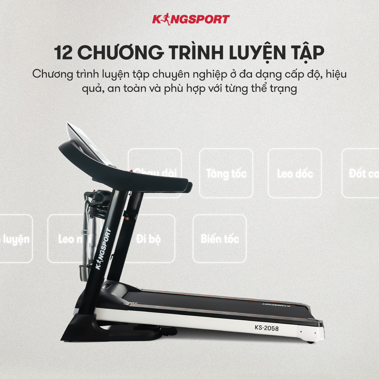 Với máy chạy bộ KingSport KS2058, chúng ta sẽ được trải nghiệm hành trình rèn luyện thể thao tuyệt vời ngay tại nhà. Với hệ thống giảm xóc tiên tiến, giao diện hiện đại và
