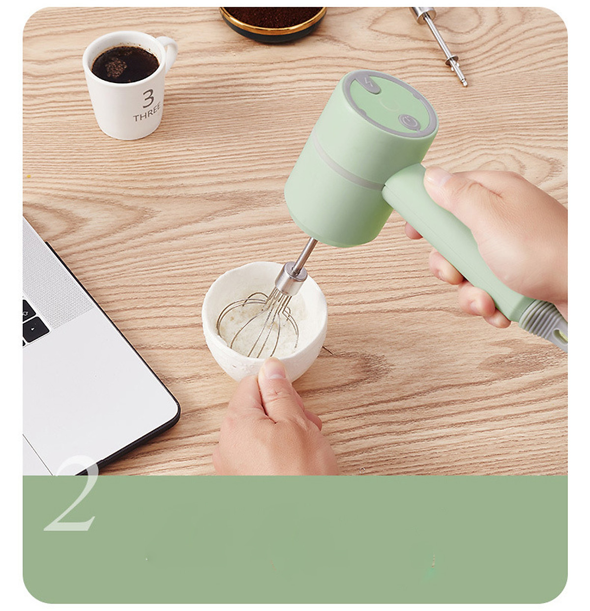 Đây là chiếc máy đánh trứng tuyệt vời cho các mẹ. Là dạng máy cầm tay, nên các mẹ có thể đánh trứng ở bất kỳ đâu: trong chén to, trong ly/cốc, trong nồ đều được. Máy đi kèm với 2 thanh đánh trứng nhiều cạnh, và 2 que xoắn để nhào bột hoặc trộn salad. Que trộn làm từ inox, có thể tháo rời được, dùng xong chỉ cần tháo ra vệ sinh que trộn là xong.