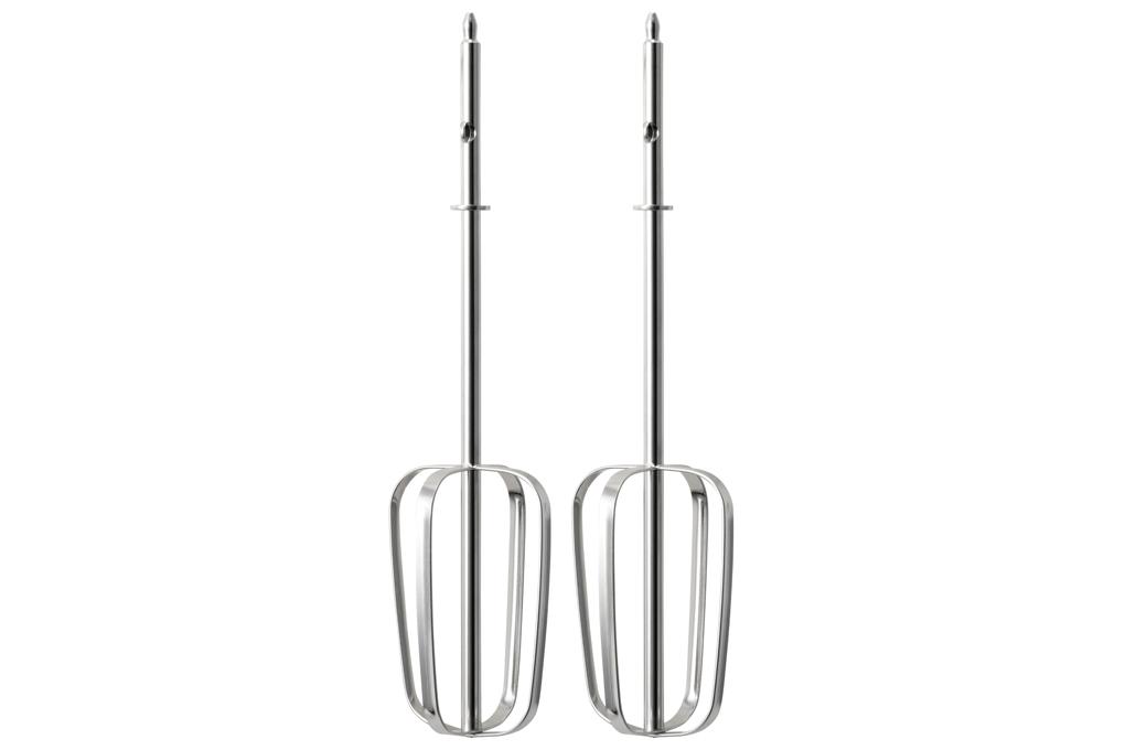 Máy đánh trứng có 2 que đánh trứng, 2 que đánh bột làm bằng chất liệu thép không gỉ sáng bóng, bền bỉ, an toàn cho sức khỏe