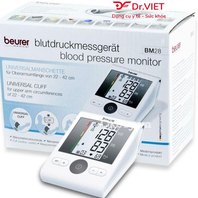 Máy đo huyết áp bắp tay Beurer BM28 giúp đo huyết áp ổn định và chính xác, thích hợp cho những người bị máu nhiễm mỡ và xơ vữa động mạch, người bị tiểu đường. Đặc biệt, máy đo huyết áp Beurer BM28 sở hữu màn hình to rộng giúp người dùng dễ dàng quan sát kết quả đo. Sản phẩm phù hợp cho người cao tuổi, sử dụng trong gia đình để kiểm tra, theo dõi huyết áp, nhịp tim, hạn chế nguy cơ mắc các bệnh nguy hiểm. Hiện nay có rất nhiều loại máy đo huyết áp trên thị trường, tuy nhiên Máy đo huyết áp bắp tay điện tử Beurer BM28 rất được tin dùng vì độ chính xác rất cao, dễ dàng sử dụng và có nhiều ưu điểm nổi trội.