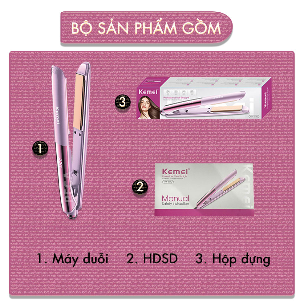 Mua tại TiktokMÁY DUỖI TÓC KEMEI KM-3142 CHUYÊN NGHIỆP ĐIỀU CHỈNH 10 MỨC NHIỆT PHÙ HỢP SỬ DỤNG VỚI MỌI LOẠI TÓC - HÀNG CHÍNH HÃNG Máy duỗi tóc Kemei KM-3142 là sự lựa chọn hoàn hảo cho những ai muốn sở hữu mái tóc thẳng mượt mà như vừa được chăm sóc tại salon ngay tại nhà. Với thiết kế hiện đại, màu sắc dễ thương tông hồng nổi bật, máy không chỉ là một công cụ làm đẹp mà còn là phụ kiện thời trang đẳng cấp. ƯU ĐIỂM NỔI BẬT: Máy duỗi tóc Kemei KM-3142 sử dụng tạo nhiều kiểu tóc chuyên dụng: duỗi thẳng, uốn cụp đuôi,.. 1/ Cấu tạo bảng nhiệt: Cấu tạo ba lớp: