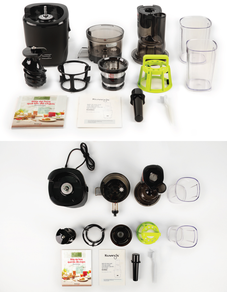 • Sách hướng dẫn công thức làm các loại Nước ép, Soup, Mojito, Cocktails, Sinh tố và Kem hoa quả, dụng cụ vệ sinh (chổi xoay và bàn chải), ca đựng nước ép và ca đựng bã ép kèm theo sản phẩm tiện lợi phục vụ những ly nước ép với hương vị phong phú hơn, màu sắc tươi hơn và giữ được toàn bộ dinh dưỡng của trái cây và rau củ quả mà không bị tách nước nhanh cho gia đình bạn.