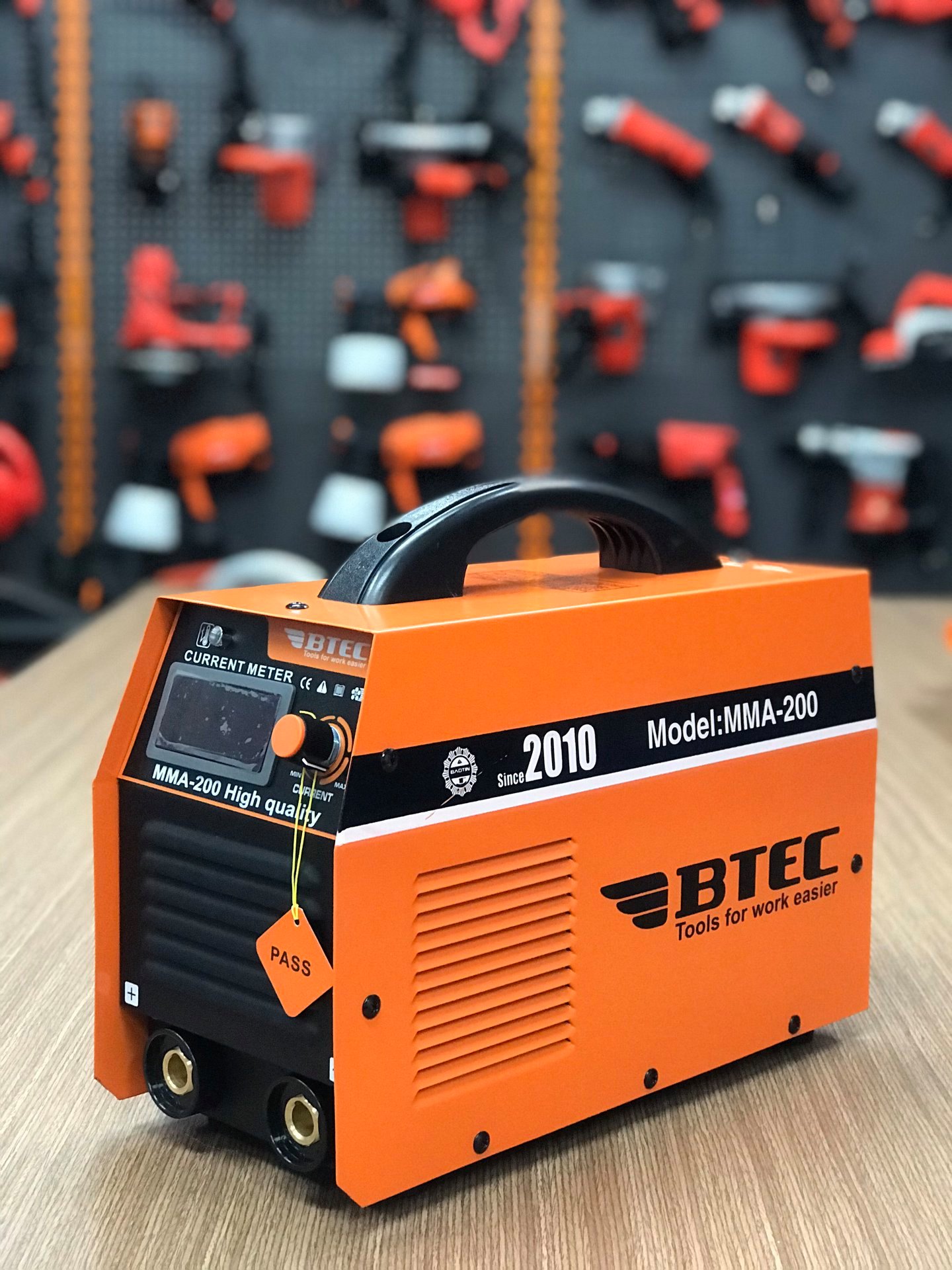 Mặt trước của máy hàn điện tử BTEC MMA-200 (xác lớn): 2 giác cắm dây hàn và dây mass đều là giác lớn, mã máy ( MMA-200 High quality), đồ hồ hiện thị dòng ra, núm điều chỉnh dòng hàn, đèn báo khi máy làm việc quá hiệu suất.