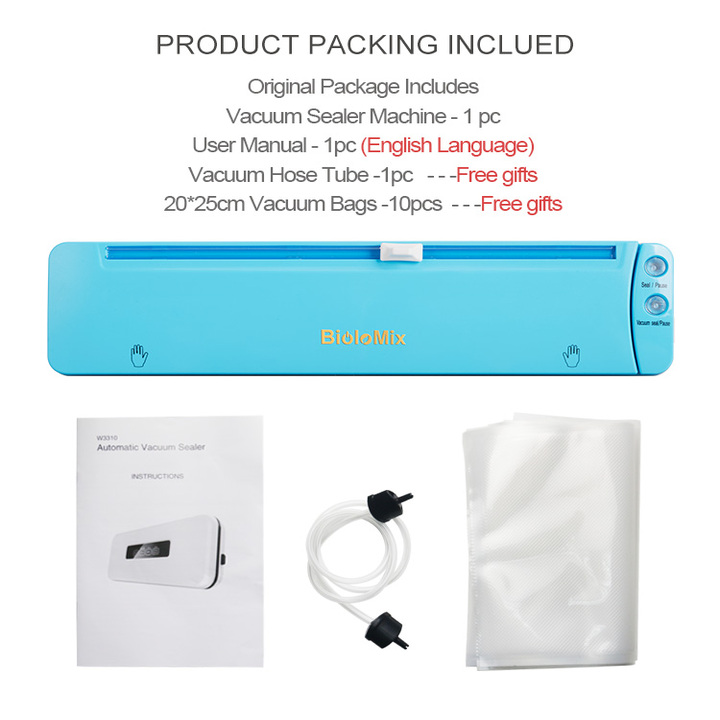 - Nấu ăn và chuẩn bị bữa ăn sẽ trở nên dễ dàng hơn, kinh tế hơn và nhanh hơn, với thực phẩm tươi sống đã sẵn sàng để được rã đông và sử dụng hoặc giữ tươi mới hơn những thực phẩm được để lưu trữ trong tủ đông, mà không bị ảnh hưởng tới chất lượng thực phẩm. Bảo vệ sức khỏe của bạn và những người thân yêu trong gia đình bằng những thực phẩm tươi ngon và bảo đảm – Tiết kiệm chi phí & Giữ tươi ngon: Máy hút chân không có thể kéo dài thời gian bảo quản thực phẩm một cách hiệu quả mà còn giúp cho việc nấu nướng và chuẩn bị bữa ăn trở nên dễ dàng và tiết kiệm hơn. – Máy hút chân không tự động Biolomix W100 có kích thước nhỏ, thiết kế mỏng, bạn có thể đặt nó vào tủ dễ dàng. Máy đóng gói chân không này cũng nhẹ, bạn có thể lấy nó bằng một tay. – Hút mạnh hơn gần như loại bỏ tất cả không khí để duy trì chất lượng và kéo dài độ tươi của thực phẩm