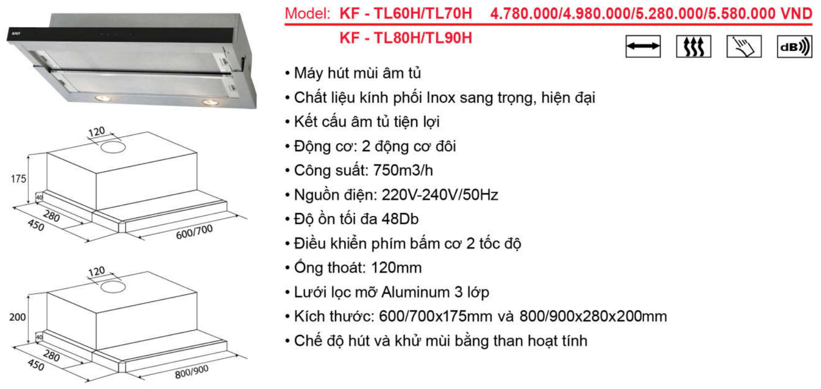 MÁY HÚT MÙI ÂM TỦ KAFF KF-TL60H / KF-TL70H / KF-TL80H / KF-TL90H | THIẾT KẾ SANG TRỌNG | HỆ ĐIỀU KHIỂN PHÍM BẤM LINH HOẠT | AN TOÀN, BỀN BỈ VÀ TIẾT KIỆM ĐIỆN
