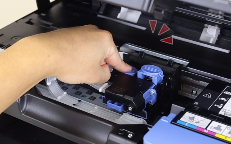 Hoàn tất việc lắp hộp mực bằng cách nhấn 2 nút khớp nối màu xanh.