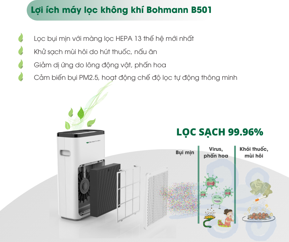 - Khử mùi hiệu quả Bạn ở trong nhà chung cư? Nhà bạn có người hút thuốc? Bạn nuôi chó mèo ? Bạn nấu ăn trong nhà có mùi hôi bám lại trong phòng ? Hãy yên tâm vì Bohmann B501 sẽ giúp bạn lọc sạch mùi hôi khó chịu. Với màng lọc carbon hoạt tính, không khí mang mùi hôi khó chịu đi qua sẽ bị màng lọc hấp thụ lại, trả lại sự tươi mát cho bầu không khí trong nhà bạn.