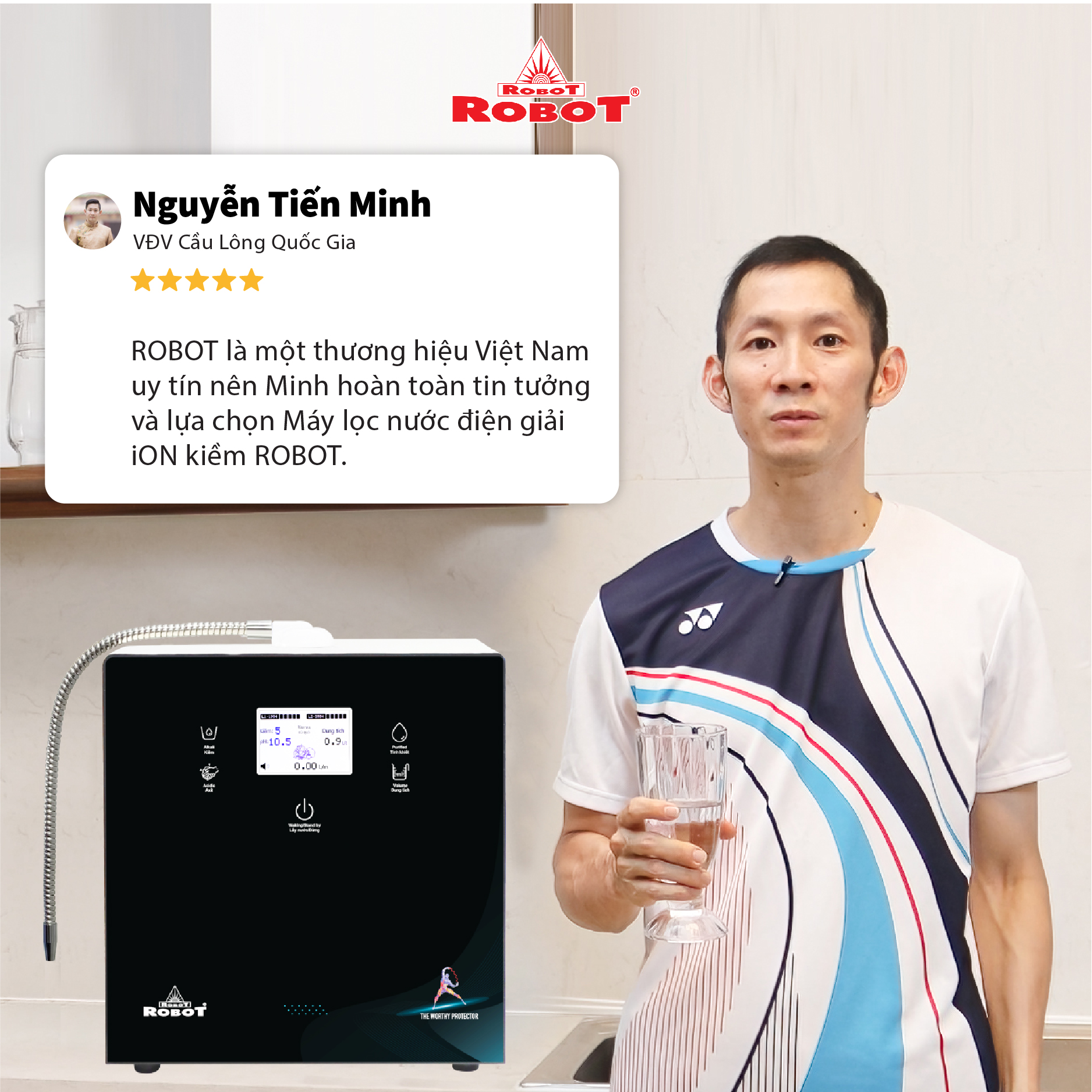 - Hệ thống điều khiển cảm ứng trên mặt phủ kính với màn hình LCD tinh tế ️ + Với mong muốn nhiều gia đình Việt có thể sử dụng nước điện giải iON kiềm với chi phí hợp lý để bảo vệ sức khỏe, sắc đẹp & nâng cao chất lượng cuộc sống, ROBOT mang đến sản phẩm “Chất lượng Quốc tế - Giá thành Việt Nam”, phù hợp với mức sống của nhiều người. Tiết kiệm cho người tiêu dùng đến hơn một nửa chí phí so với máy nhập khẩu chỉ từ 30 – 50%, nhưng sở hữu nhiều ưu điểm, tính năng vượt trội, chất lượng cao. ️ + Chế độ bảo hành chính hãng, tận nơi, vật tư và linh kiện, lõi lọc luôn có sẵn hạn chế tối đa chi phí sửa chữa, bảo trì. VĐV Cầu Lông Nguyễn Tiến Minh – tay vợt từng đứng Top 5 Thế Giới chia sẻ: Sau một thời gian sử dụng Máy lọc nước điện giải iON kiềm Minh thấy cải thiện sức khỏe rất nhiều và tốc độ hồi phục sau tập luyện, thi đấu cũng nhanh hơn so với trước đây. Bây giờ mỗi khi đi tập, hay khi đi thi đấu, Minh đều mang theo nước iON kiềm để uống. ROBOT là một thương hiệu Việt Nam uy tín nên Minh hoàn toàn tin tưởng và lựa chọn Máy lọc nước điện giải iON kiềm ROBOT. ️Thông Tin Thương Hiệu CÔNG TY CỔ PHẦN ĐẦU TƯ ROBOT
