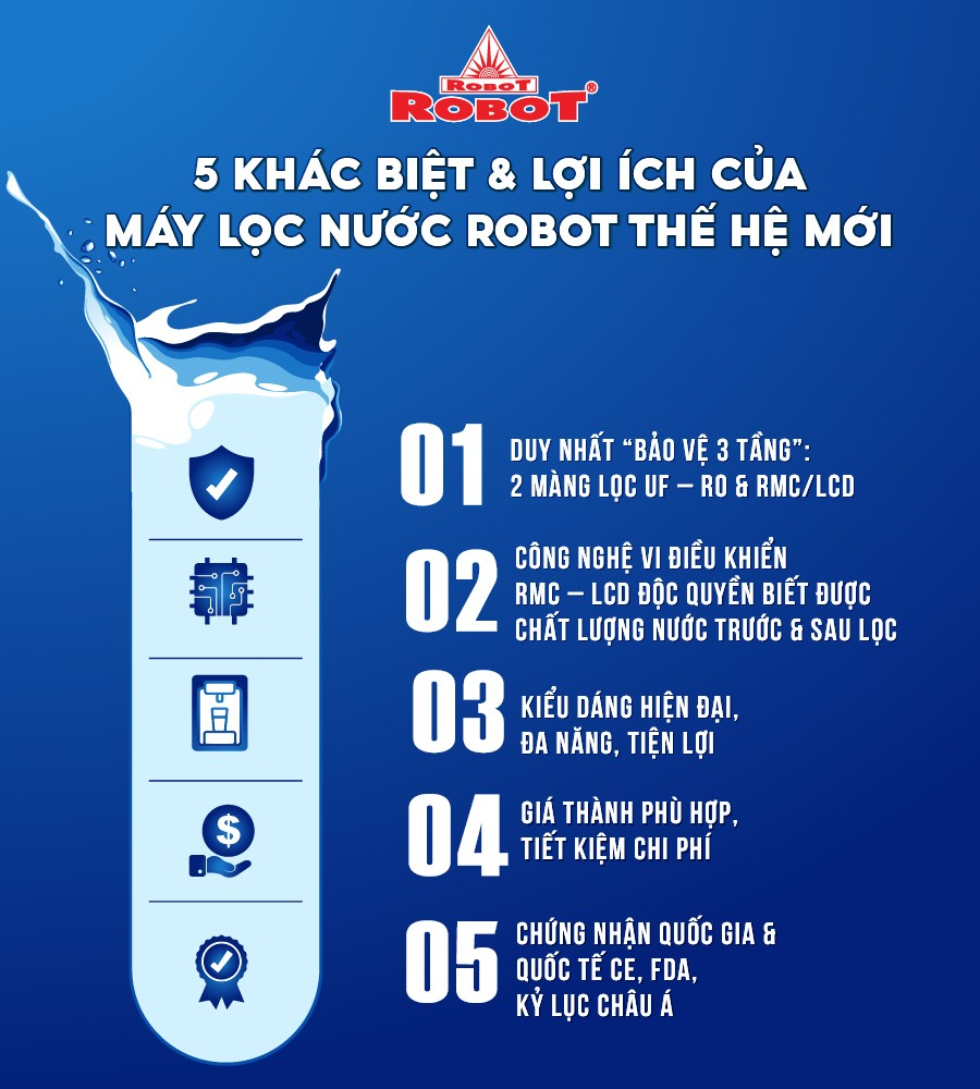 - Các sản phẩm máy lọc nước ROBOT đều sở hữu màn hình LCD sắc nét, hiển thị chi tiết các thông số TDS – chất lượng nước trước & sau lọc, tuổi thọ lõi lọc 24/24… để mọi người đều dễ dàng theo dõi hoạt động máy, chất lượng nước uống thông qua màn hình LCD, loại trừ mọi rủi ro, mang đến sự an toàn tuyệt đối khi sử dụng.
