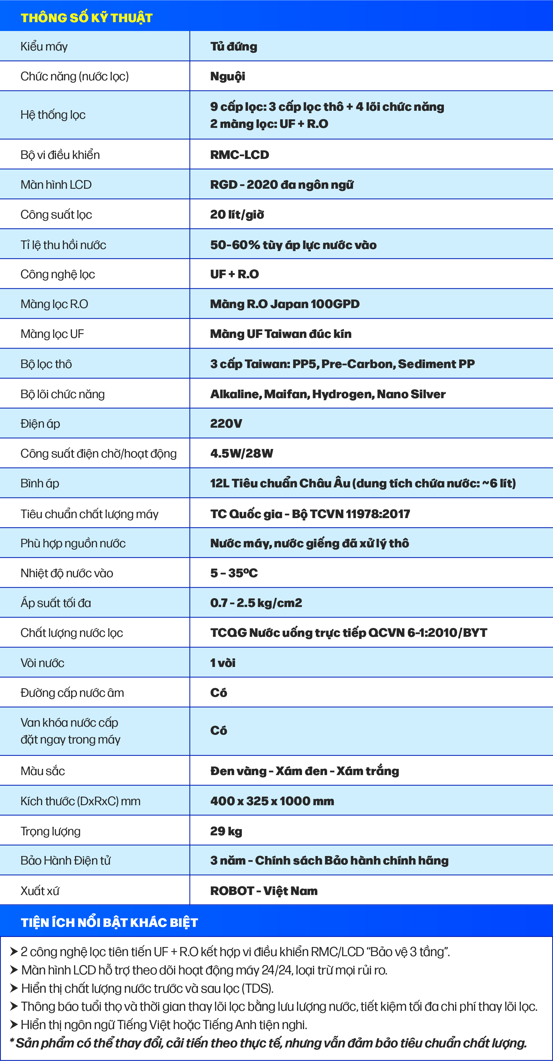 Tổng quan - Kiểu lắp đặt:Tủ đứng - Loại máy:Máy lọc nước RO nóng nguội lạnh - Công nghệ lọc:Thẩm thấu ngược RO - Kháng khuẩn:Nano Silver - Dung tích bình chứa:Tổng 7.8 lít (Nước nóng 0.8 lít, nước lạnh 1 lít, nước thường 6 lít) - Tỷ lệ lọc - thải:Lọc 4.8 - Thải 5.2 (Tỷ lệ này phụ thuộc vào chất lượng nước đầu vào) - Công suất lọc:18 lít/giờ - Công suất tiêu thụ điện trung bình khoảng:0.628 kW/h - Nhiệt độ nước hãng công bố:Nóng 80 - 90°C, Lạnh 10°C - Nhiệt độ nước thực tế:Nóng 80 - 90°C, Lạnh 10°C - Áp lực nước yêu cầu:0.07 - 0.25 MPa - Nơi sản xuất máy bơm:Trung Quốc - Năm ra mắt:2023 - Thương hiệu:Việt Nam - Nơi sản xuất:Việt Nam Thông tin lõi lọc - Số lõi lọc:10 lõi -