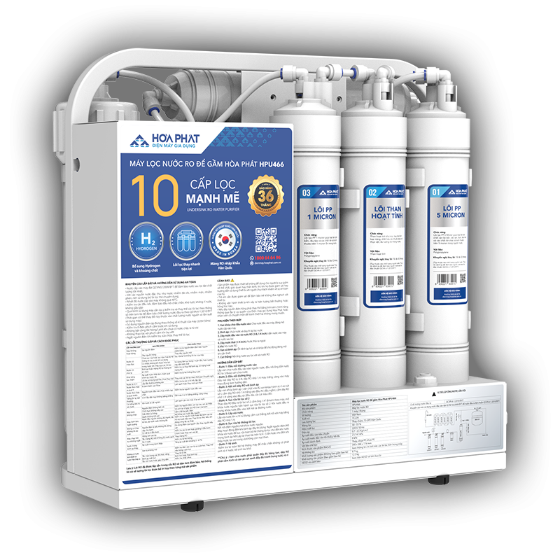 - Bảo hành vượt trội từng linh kiện lên tới 36 tháng. THÔNG SỐ KỸ THUẬT Thương hiệu:Hòa Phát Điện áp:220V/ 50Hz Công suất điện:35W Lưu lượng lọc:15L/ h Số cấp lọc:10 Màng lọc:RO 75 GPD từ Hàn Quốc Hệ thống lọc thô:3 cấp lọc thô (PP 5 micron, Than hoạt tính, PP 1 micron) Các lõi chức năng:6 lõi (T33 GAC, Maifan, Tourmaline, Far Infrared, Nano Silver, Hydrogen) Hiệu suất lọc:40 - 50 % (Điều kiện phòng LAB, nhiệt độ 25° C) Bơm:Lanshan LS-ZX-50E Áp suất tối thiểu, tối đa:10-125 psi (0,7 - 8,6 bar) Tiêu chuẩn áp dụng:TCVN 11978:2017 Chất lượng nước đầu ra:QCVN 6-1:2010/BYT Vật liệu: Thép, Nhựa PP, Nhựa PE… Kích thước sản phẩm:370x447x235 (mm) Xuất xứ:Việt Nam