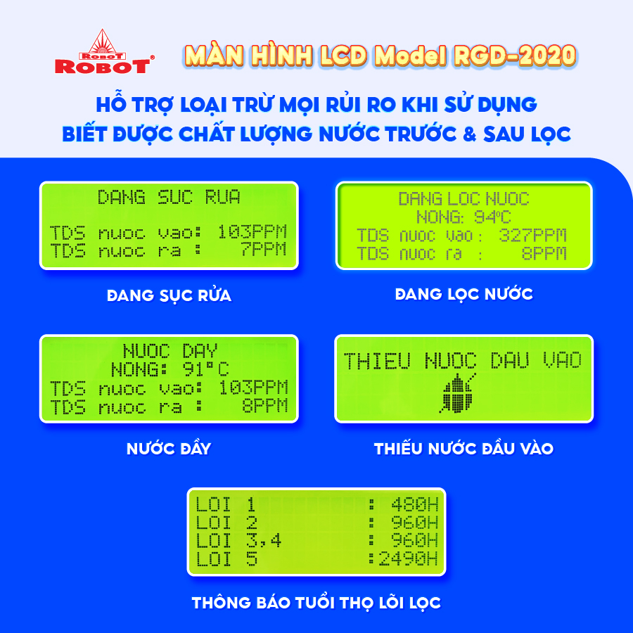 - Các sản phẩm máy lọc nước ROBOT đều sở hữu màn hình LCD sắc nét, hiển thị chi tiết các thông số TDS – chất lượng nước trước & sau lọc, tuổi thọ lõi lọc 24/24… để mọi người đều dễ dàng theo dõi hoạt động máy, chất lượng nước uống thông qua màn hình LCD, loại trừ mọi rủi ro, mang đến sự an toàn tuyệt đối khi sử dụng.