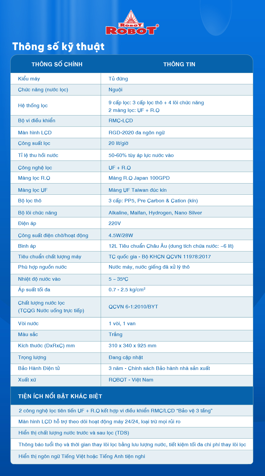 Tổng quan - Kiểu lắp đặt:Tủ đứng - Loại máy:Máy lọc nước RO nóng nguội lạnh - Công nghệ lọc:Thẩm thấu ngược RO - Kháng khuẩn:Nano Silver - Dung tích bình chứa:Tổng 7.8 lít (Nước nóng 0.8 lít, nước lạnh 1 lít, nước thường 6 lít) - Tỷ lệ lọc - thải:Lọc 4.8 - Thải 5.2 (Tỷ lệ này phụ thuộc vào chất lượng nước đầu vào) - Công suất lọc:18 lít/giờ - Công suất tiêu thụ điện trung bình khoảng:0.628 kW/h - Nhiệt độ nước hãng công bố:Nóng 80 - 90°C, Lạnh 10°C - Nhiệt độ nước thực tế:Nóng 80 - 90°C, Lạnh 10°C - Áp lực nước yêu cầu:0.07 - 0.25 MPa - Nơi sản xuất máy bơm:Trung Quốc - Năm ra mắt:2023 - Thương hiệu:Việt Nam - Nơi sản xuất:Việt Nam Thông tin lõi lọc - Số lõi lọc:10 lõi -