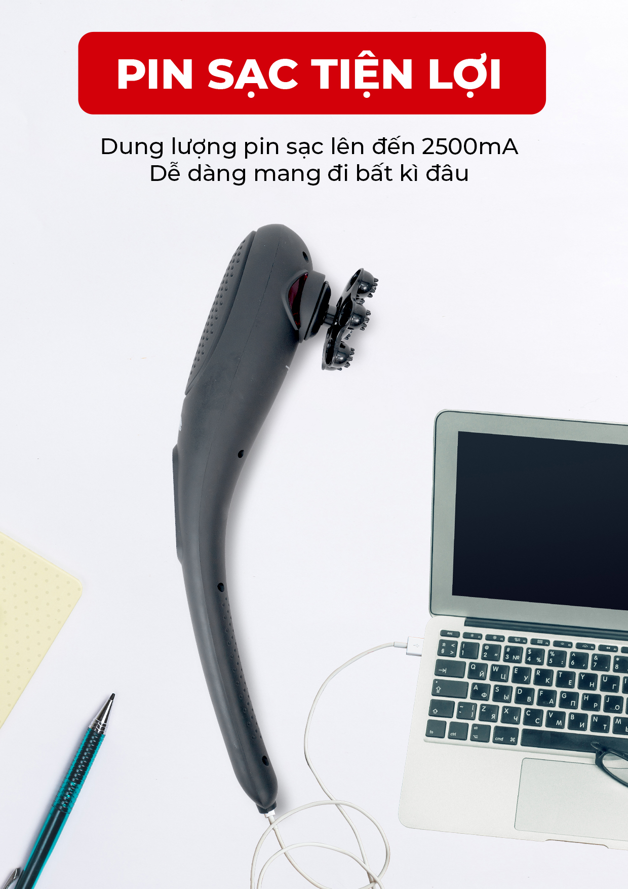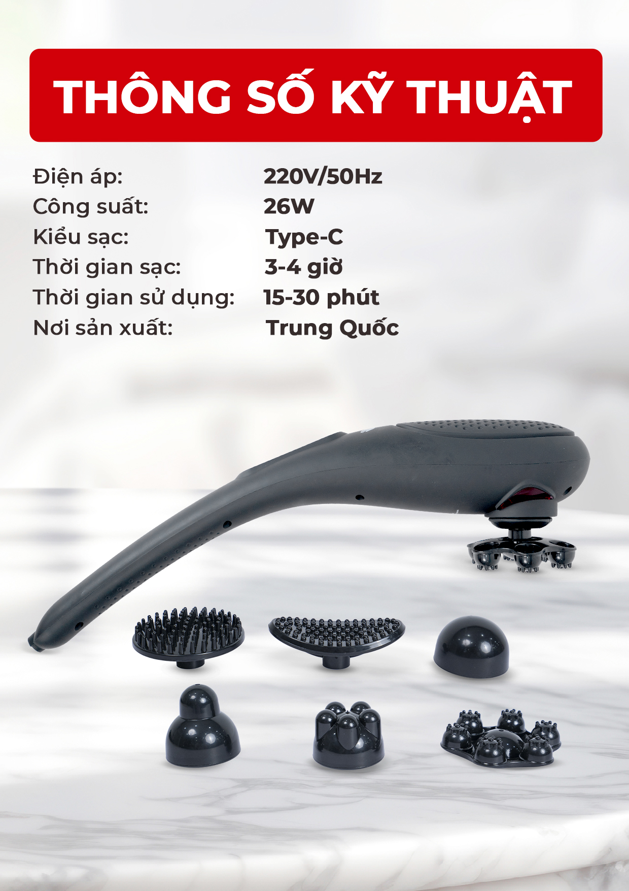 - Có 4 đầu massage: đầu hình cầu, đầu chữ U, đầu phẳng, đầu hình trụ - Tốc độ động cơ: 3200 PRM - Thời gian sạc 3h - Dung lượng pin: 2000 mAh -
