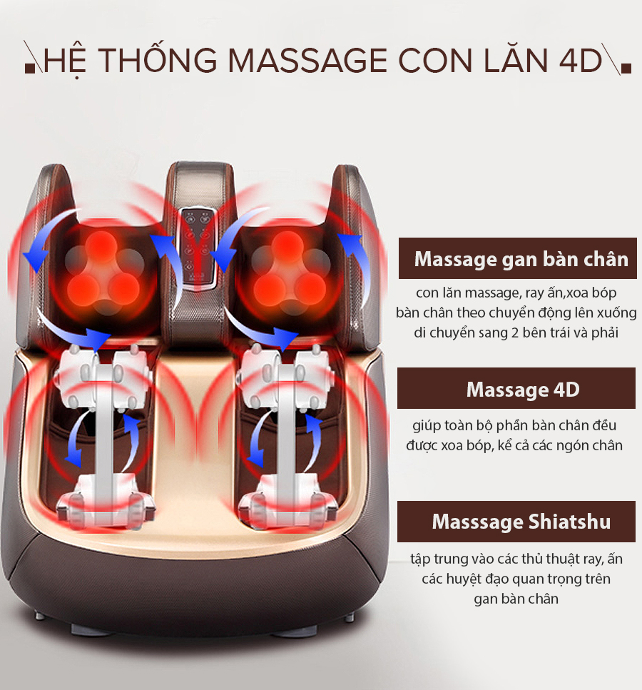 Các con lăn chuyển động 3D theo mọi hướng, tác động chuyên sâu và đều đến vùng cần điều trị, cảm giác chân thật như bàn tay con người đang thao tác. Những con lăn với các gai massage định vị được vị trí huyệt đạo giải phóng nhanh cảm giác tê nhức.