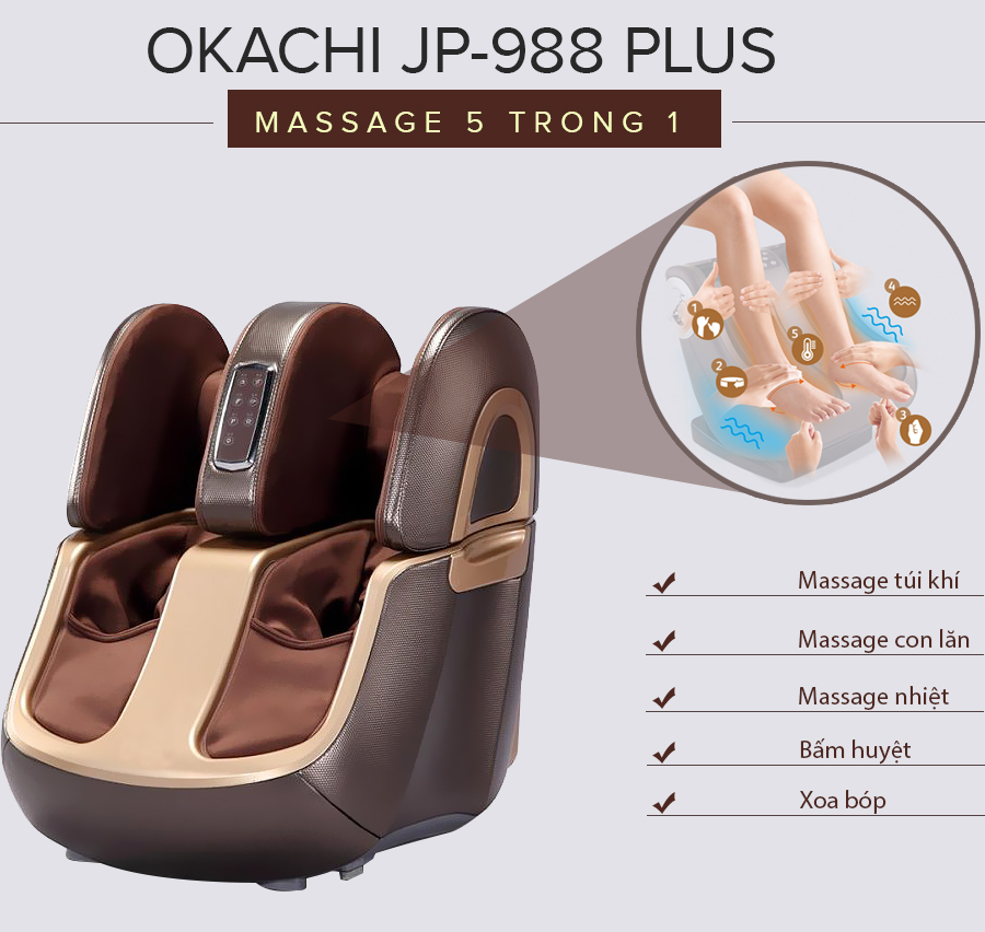 Máy massage chân thông minh 4D OKACHI JP-988 Plus, công nghệ chăm sóc sức khỏe thông minh đến từ Nhật Bản, thiết kế hoàn hảo tích hợp nhiều kỹ thuật massage chuyên nghiệp, chủ yếu tập trung cho vùng lòng bàn chân, ngón chân, gót chân, mu bàn chân, bắp chân, đầu gối, đùi. Sản phẩm sẽ mang đến cho bạn sự trải nghiệm hoàn toàn mới mẻ và thú vị ngay tại nhà, cảm giác tận hưởng thoải mái như đang ở trung tâm spa.