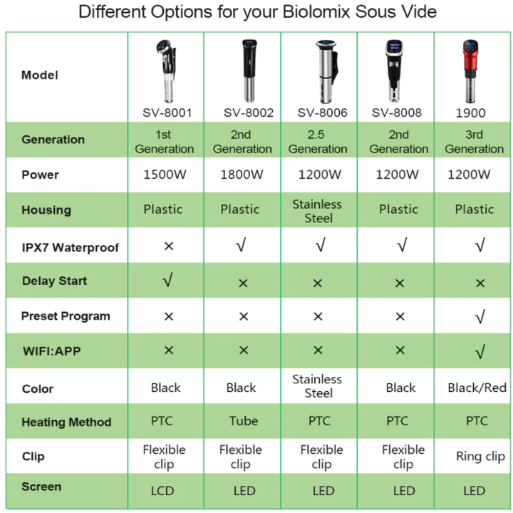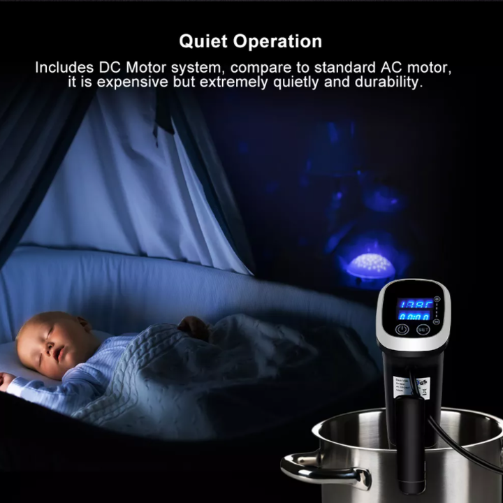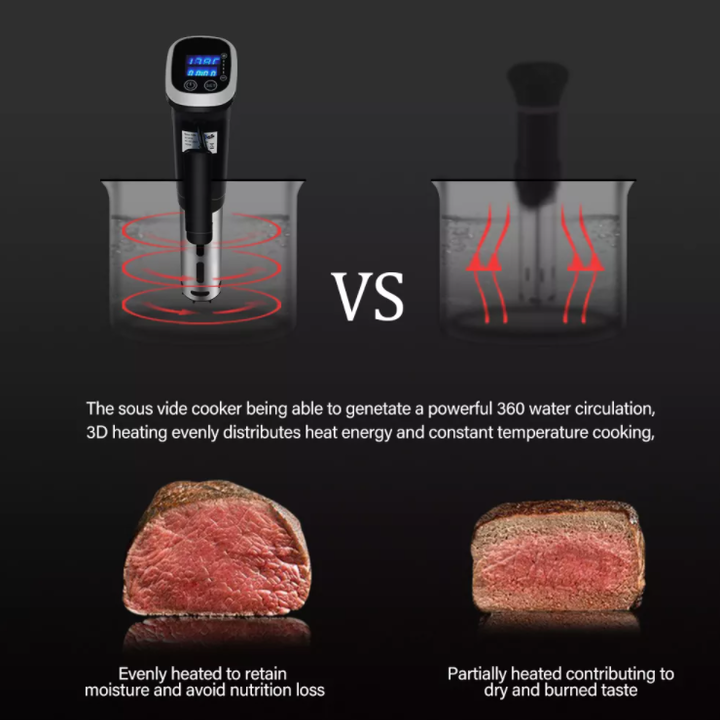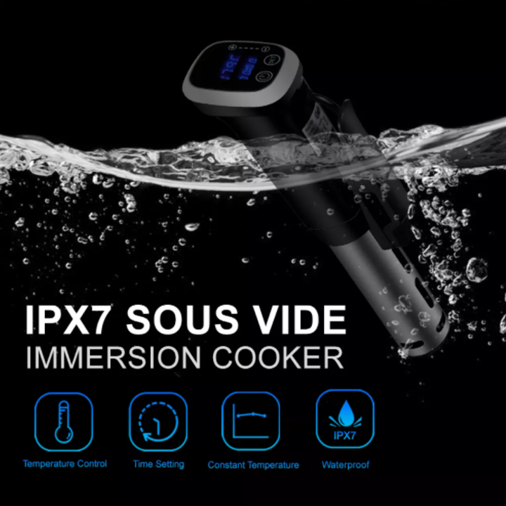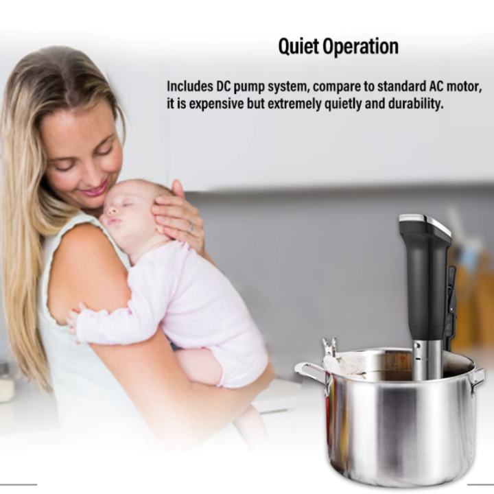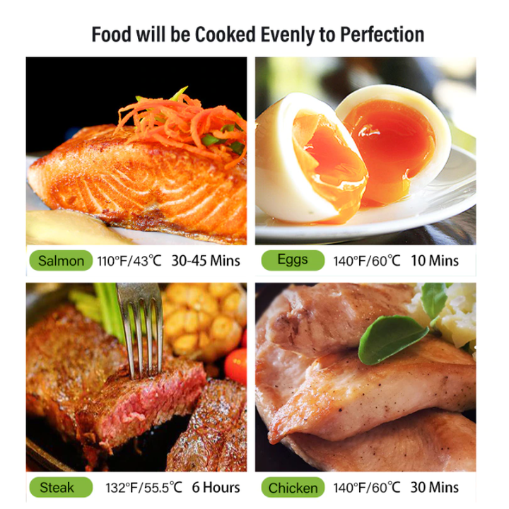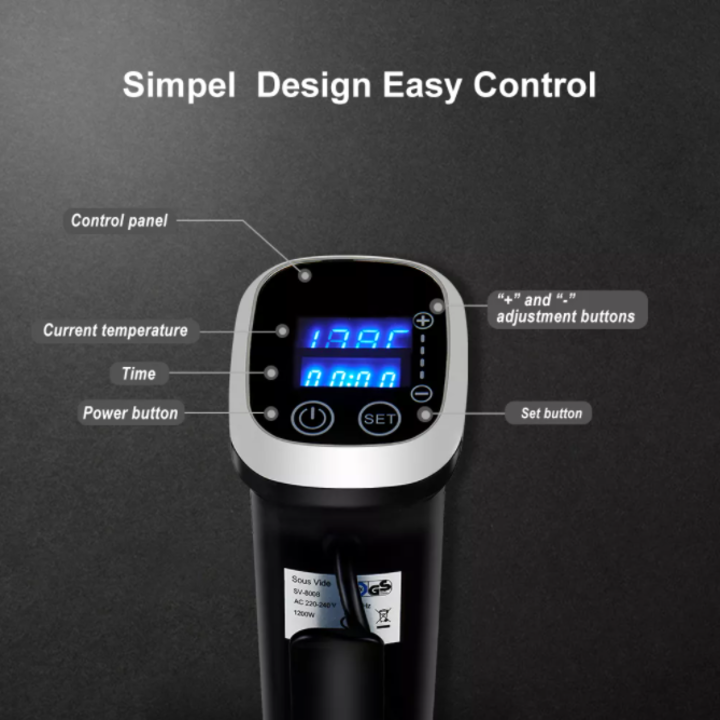 - Đảm bảo được màu sắc tự nhiên, vẻ thẩm mỹ của thực phẩm; gia tăng hiệu quả nấu ăn - Chất lượng ổn định, an toàn suốt quá trình nấu BioloMix Sous vide SV-8008 công suất cao tối đa 1200 watt cho thời gian nấu và làm nóng trước chắc chắn nhanh hơn rất nhiều so với các loại Sous vide khác có trên thị trường chỉ sử dụng 800 watt hoặc 1000 watt Nấu ăn như một Cheef Pro – Bộ nấu ăn mới Biolomix Sous vide SV-8008 mới cho phép bạn nấu một bữa ăn chất lượng như nhà hàng tại nhà. Bếp Sous Vide của chúng tôi là thiết bị nhà bếp hoàn hảo để nấu các loại rau, thịt và hơn thế nữa với khả năng kiểm soát nhiệt độ nấu nhất quán và chính xác. Tính năng hoàn hảo – Bảng điều khiển Hẹn giờ-Kỹ thuật số chính xác giúp nhiệt độ chính xác đến 0,1 ℃ và thời gian tính đến hàng phút. Phạm vi nhiệt độ đa dạng (Tối đa 90 ℃) và kiểm soát thời gian cho phép bạn nấu bất kỳ loại thực phẩm nào bạn thích. Chế độ nấu bằng Sous vide ngăn chặn tối đa mất nước cần thiết và giữa lại hương vị cho món ăn. Dễ đáng sử dụng và vệ sinh – Chỉ cần gắn nồi vào bất kỳ nồi nào, thêm nước, cho các nguyên liệu của bạn vào túi hút chân không. Bắt đầu nấu chỉ với một nút bấm trên thiết bị. Chế độ hẹn giờ và kiểm soát nhiệt độ của nồi Sous vide cho phép bạn thư giãn trong khi nấu ăn, các phần tiếp xúc nước bằng thép không gỉ có thể tháo rời của bếp sous vide an toàn và vệ sinh dễ dàng, thiết bị nhà bếp này dễ dàng vệ sinh và bảo trì. Làm nóng nhanh