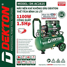 1. THÔNG SỐ KỸ THUẬT: Máy Nén Khí Giảm Âm Không Dầu 1.5HP / DK-AC2825 / Thể Tích 25L + Thương hiệu: DEKTON + Điện Áp :220v/50Hz + Công Suất 1.5Hp / 1110W + Tốc Motor : 2800rpm/min + Đ...