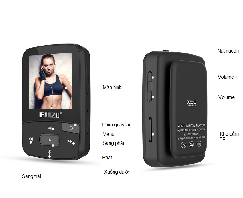 - 01 Sách thông tin sản phẩm. THÔNG SỐ KỸ THUẬT Mã sản phẩm RUIZU-X50 Thương hiệu RUIZU Định dạng hỗ trợ MP3, WMA, OGG, WAV, APE, FLAC, and ACELP Microphone (ghi âm) built-in microphone Kết nối USB 2.0 Loại pin Built-in Li-battery 240mAh Kích thước 54mm(L)*34mm(W)13mm(H) Trọng lượng 30g Bộ nhớ trong 8GB Thời gian chơi nhạc 55h Hỗ trợ thẻ nhớ ngoài 32GB, 64GB Tính năng đặc biệt FM transmitter Tính năng khác Ghi âm, nghe đài FM Màn hình TFT screen Kích thước màn hình 1.5 inches