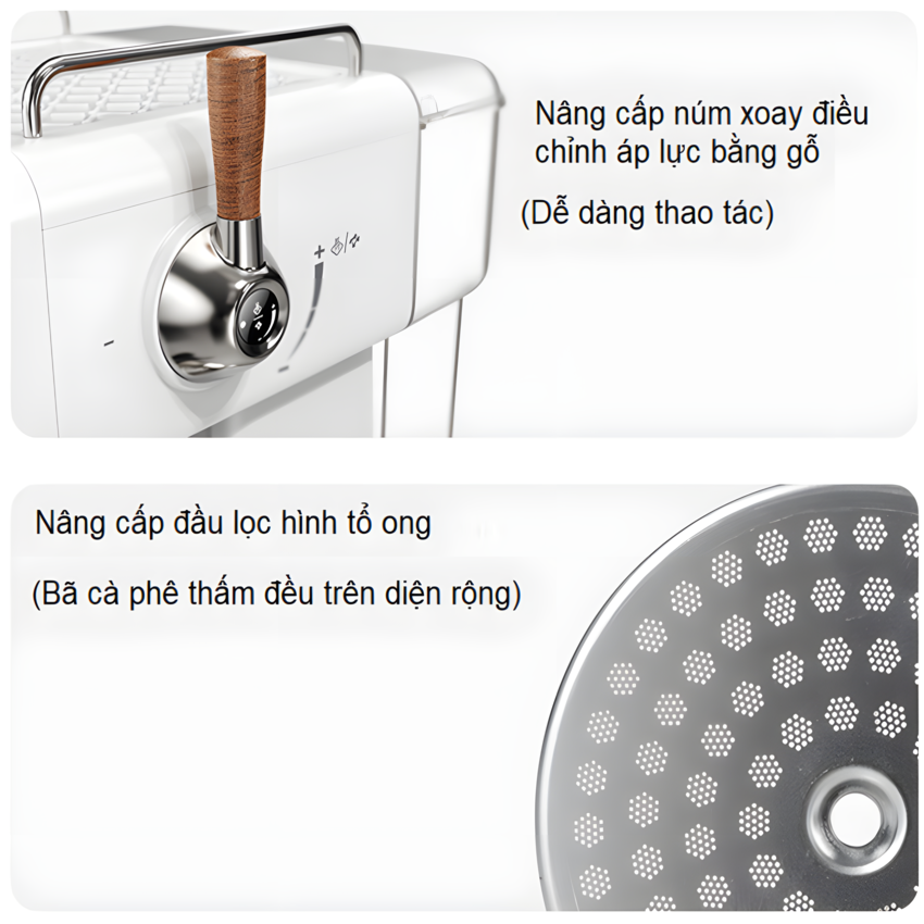 - Bộ phụ kiện bao gồm: 1 máy chủ; 1 tay pha chuyên nghiệp ; x3 phin lọc inox ; 1 tay nén inox 58mm ; 1 ca đánh sữa ; 1 thìa múc bột kiêm bàn chải vệ sinh; 1 sách HDSD