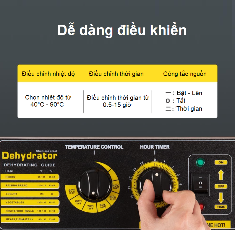 - Chính hệ thống gia nhiệt 360 độ thông minh này giúp thực phẩm được sấy chín đều, ngon và khô nhanh hơn từ 40 đến 50% so với dòng mày thường. Rút ngắn thời gian sấy và tiết kiệm điện năng tiêu thụ đáng kể. Đây chính là điểm khác biệt lớn so với các dòng máy thông thường.