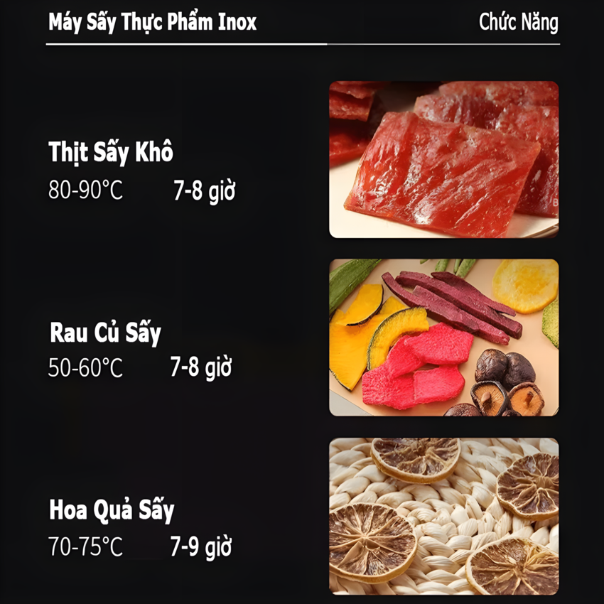 - Sấy thịt cá với biên độ nhiệt từ 70- 90°C: là trợ thủ đắc lực khi bạn bạn làm các món khô gà, khô bò, khô heo, khô nai, khô mực, khô cá..vv