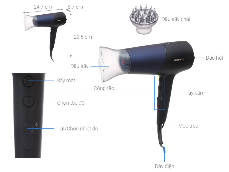 Mua tại TiktokMáy sấy tóc Philips với tone đen huyền bí với công suất hoạt động 2300W giúp sấy tóc nhanh khô, tiết kiệm thời gian hơn Cảm biến phát hiện và kiểm soát khi nhiệt độ máy quá nóng giúp bảo vệ tóc không bị hư tổn với công nghệ ThermoShield 2 tốc độ sấy tùy chỉnh bằng nút trên máy với chế độ sấy mát giúp bảo vệ tóc, giữ tóc chắc khỏe và óng mượt Chế độ sấy ion tạo ra tới 40 triệu trên một lần sấy mang lại cho bạn mái tóc khỏe khoắn, bóng mượt, không bị rối Máy sấy tóc trang bị móc treo tiện dụng, giúp bạn dễ dàng bảo quản sản phẩm Sử dụng máy sấy tóc an toàn: