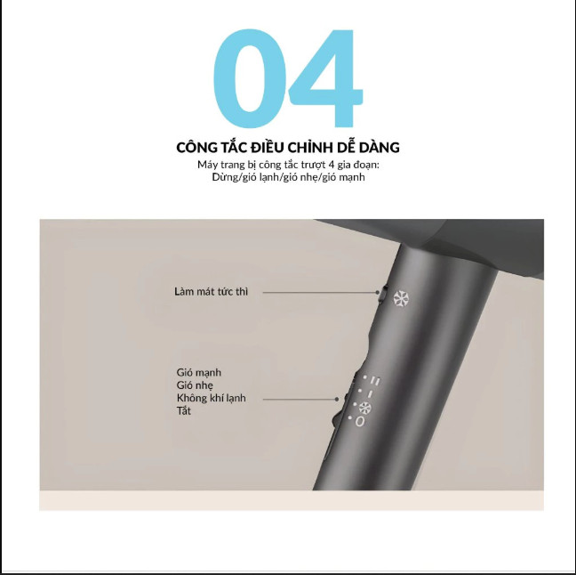 Động cơ không chổi than tốc độ cao 110.000 rpm, tốc độ gió 65m/s, làm khô tóc ngắn chỉ trong 40 giây Cảm biến kiểm soát nhiệt thông minh NTC, kiểm soát nhiệt độ 100