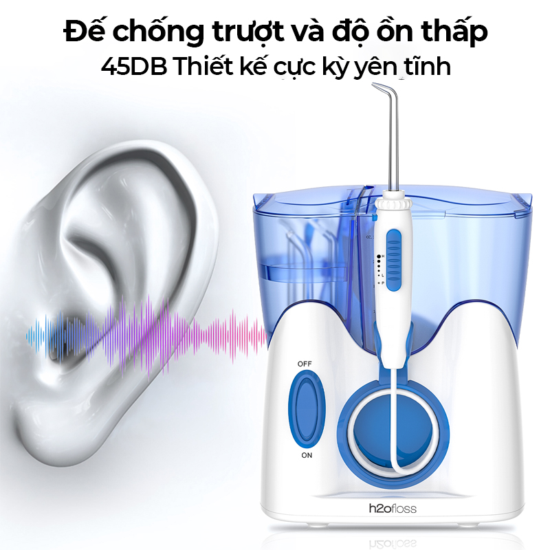 Máy tăm nước H2ofloss HF-9 là dòng máy tăm nước để bàn dùng cho gia đình chuyên nghiệp. Đi kèm 12 đầu tăm thay thế: 4 đầu tăm tiêu chuẩn, 2 đầu dành cho chỉnh nha/niềng răng, 2 đầu cho nha chu, 2 đầu cho lưỡi, 2 đầu cho mũi. Dung tích bình nước 800ml.   Máy tăm nước H2ofloss HF-9 có 6 chế độ cài đặt áp lực nước trong đó có 1 chế độ tạm dừng “Pause”. Áp lực nước có thể điều chỉnh ở rải rộng từ 5-110 PSI. Đáp ứng tối đa nhu cầu của nhiều người dùng, và nhiều tình trạng răng miệng. Chỉ cần chọn một mức độ phù hợp bạn sẽ thấy việc sử dụng máy tăm nước H2ofloss rất dễ dàng và thoải mái.     Máy tăm nước H2ofloss HF-9 là bản nâng cấp của HF-8. Thiết kế mới giúp máy giảm độ ồn tốt hơn HF-8 và có độ yên tĩnh hơn nhiều so với hầu hết các thương hiệu trên thị trường. Theo thông số kỹ thuật hãng đưa ra. Độ ồn của HF-9 là <50db. Các hãng máy khác có độ ồn ở mức < 70db. Máy tăm nước H2ofloss HF-9 có khả năng tự ngừng hoạt động khi quá nóng và có thể khởi động lại sau 2h giúp duy trì độ bền tốt hơn.     THÔNG SỐ KỸ THUẬT MÁY TĂM NƯỚC H2OFLOSS HF-9