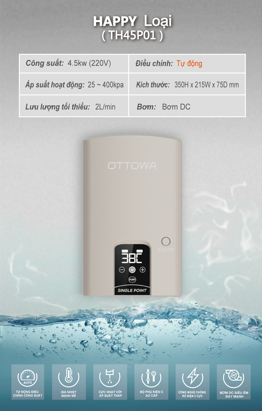 ✨Máy tắm nước nóng OTTOWA TH45P01- Hàng chính hãng