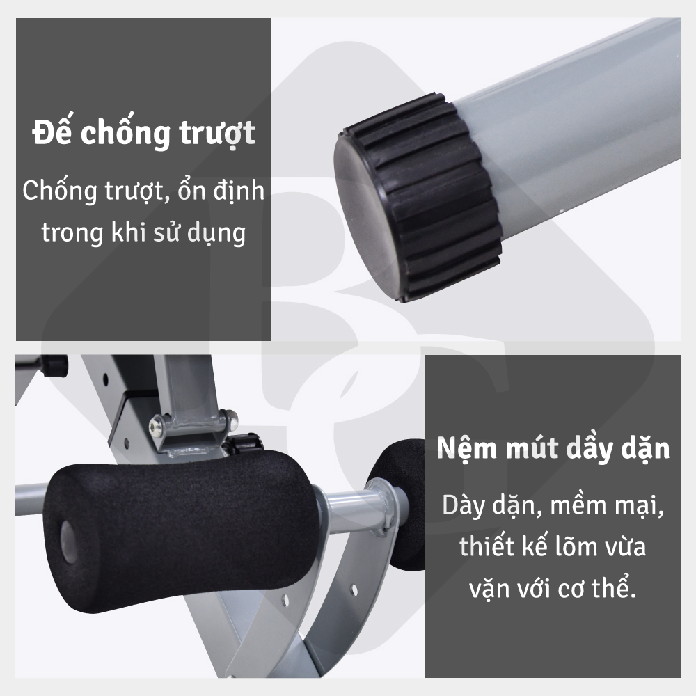 Chức năng và cấu tạo của đệm ghế: hệ thống đệm ghế hỗ trợ xoay 360 độ, dễ sử dụng và tác động hầu hết với cơ bụng trên và dưới, đùi, bắp chân,…. Đệm ghế được làm từ đệm mút êm ái, bên ngoài bọc một lớp da PVC chọn lọc rất đẹp và bền